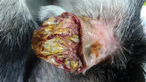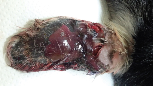 Fig. 2. Skin necrosis at the distal 2/3 of the convex surface of the right ear pinna of the 3-day-old goat kid of Figure 1. After clipping the hair of the left pinna, it was observed that the skin of the convex surface was bruised; the epidermis was easily detached at some parts, but the skin underneath was intact (Fig. 3). The convex surface of the pinna was surgically prepared, and the hematoma was drained by using a Penrose tube. At first, an incision was made at the distal border of the hematoma using a scalpel with a No 10 surgical blade. After removing the hematoma content, the cavity was flushed with 1ml of dexamethasone 2 mg/ml solution diluted in 4 ml of normal saline. After that, a Pean forceps was inserted in the cavity until the proximal border of the hematoma, and a second incision was made. A Penrose drain (Kendall Tyco, Mansfield, MA, USA) (6 mm) was inserted from the proximal incision through the cavity and was exited from the distal one (Fig. 3). The drain was sutured to the skin with two simple interrupted sutures using absorbable sutures (PGA 2/0; Medipac, Greece). The right ear pinna was surgically prepared, and all necrotized, edematous tissues and blood clots were removed. After a thorough inspection, it was observed that the pocked was extended to the base of the ear pinna. In addition, the ear cartilage was thickened throughout. Therefore, it was decided not to resect the pinna completely but to be left to heal by secondary intention (Fig. 4). All the procedures were completed within 30 minutes, and the kid was able to stand within 1 hour after the administration of anesthesia. After the complete restoration of suckling reflex, the kid was bottle fed with 200 ml of warmed (39oC) goat milk. When the animal was released, 2 hours after standing, the rectal temperature was 39.2oC and blood glucose was 98 mg/dl. Postoperative treatment consisted of: (a) intramuscular administration of lincomycin-spectinomycin once per day for 5 days, (b) twice a day lavage of the right pinna with a chlorhexidine solution 1% until granulation, and (c) daily cleansing of the incision sites of the left pinna with chlorhexidine solution 1%. It was suggested the Penrose drain be removed after 5 days. It was also advised that the kid be kept separated from the rest of the flock and be bottle-fed 3–4 times per day.