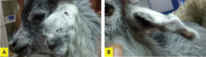 Fig. 6. Lateral (A) and frontal (B) view of the right ear pinna of the goat kid of Figure 2 2 months after surgery. At admission, the kid was generally in good condition. Apart from the observed lesions at both ears, the only remarkable findings at the clinical examination were moderate depression and mild hypothermia. The latter is attributed to the low blood glucose concentration (Abdolvahabi et al., 2016), probably because of reduced appetite. On the other hand, depression could be possibly associated with pain and hypoglycemia. In order to confront with the pre-existing hypoglycemia—hypothermia and to prevent further worsening of this condition during anesthesia, it was selected to use a heat pad, to cover the kid with double layer cotton surgical drapes and to administer 2.5% dextrose solution intravenously (Abrahamsen, 2008). The anesthetic protocol used in this case provided an adequate depth of anesthesia throughout the followed procedures, and the recovery was completed without complications. According to Abrahamsen (2008), the selected combination of anesthetics generally produces 30–40 minutes of recumbency. However, the recumbency in this goat kid lasted longer, probably because of the pre-existing depression and the administration of the highest suggested dosage of xylazine for this protocol (Abrahamsen, 2008). Based on the asymmetry observed between the medial and the lateral surface of the ear pinna and the more intense fluctuation at the convex surface, we concluded that the fluid-filled cave was formatted between the cartilage and the skin of the convex surface. This contrasts with the typical site for dogs (Macphail, 2016) and the former reports for ruminants where the blood accumulation was observed in the concave surface (Tsioli et al., 2013; Dewangan et al., 2016). However, the initial cause of the hematoma in the present case was not a self-induced trauma caused by head shaking (Tsioli et al., 2013; Dewangan et al., 2016) but exogenous injuries, which occurred at the outer surface of the ear pinna. Based on the hematoma location, it was decided to drain the hematoma from the lateral surface of the pinna, despite the recommended access from the concave one (Macphail, 2016). The placement of Penrose drains is a very common treatment option for aural hematomas in dogs and cats (Hall et al., 2016). It was selected in the present case because it is a minimally invasive technique and cost-effective for a farm animal. There is only one report in the available literature in small ruminants using Penrose tube drainage (Tsioli et al., 2013); however, in that case, inflammation was developed postoperatively, and the animal underwent a second surgical intervention using incisional drainage. Before the placement of the Penrose drain in the present case, the cavity was flushed with dexamethasone solution of 0.4%. The contribution of dexamethasone flushing at the positive outcome of this case remains questionable since there is no other similar report in ruminants. However, evidence in the literature for dogs indicates that injection of corticosteroids directly into the hematoma cavity following drainage is associated with successful resolution in more than 90% of cases (Kuwahara, 1986; Romatowski, 1994; Seibert and Tobias, 2013). Despite the recommendation for bandaging after the tube drainage technique to avoid subsequent infection (Tsioli et al., 2013), it was selected not to use a head bandage. This decision was based on the fact that the skin at the convex surface was not intact and since biting was the cause of the lesion, it was supposed that there would be an increased risk for anaerobic bacteria overgrowth after bandaging. Besides, it was possible for the farmer to keep the kid separate from the rest of the flock in a clean pen and to apply the topical antiseptic twice a day, so the risk of subsequent infection was minimized. The trauma detected at the right ear pinna and especially the remaining pocket under the intact skin cannot exclude the possibility that the initial lesion was also an auricular hematoma. It could be hypothesized that the repeated biting of the pinna resulted in skin necrosis and finally, the rupture of the hematoma. The thickening of the ear cartilage denotes the presence of inflammation. The origin of this inflammation is unknown; it is believed that it resulted from mechanical irritation due to biting and/or bacterial infection. Due to the presence of inflammation, there were two treatment options. The first one was secondary intention healing, and the second one the complete resection of the ear pinna. It was decided to follow the first option since the pocket and the thickening of the cartilage were very extended and made doubtful the presence of healthy tissue at the pinna base. In addition, the second option would increase the time required for anesthesia. Nevertheless, the healing was successful with forming a relatively small scab as expected due to skin loss at the tip of the remained pinna. Post-surgery it was suggested, apart from the application of a topical antiseptic in both pinnae, the kid to be treated with a lincomycin-spectinomycin. This combination of antibiotics was selected mainly because of lincomycin which is effective against Gram-positive cocci and most anaerobes (Pechere, 1986) and is widely used to treat bacterial skin infections (Noble, 1990). ConclusionsThe present case indicates that aural hematoma can occur in newborn goat kids secondary to ear pinna biting and might evolve to pinna necrosis. In addition, tube drainage after flushing the cavity with corticosteroids appears to be an effective treatment approach without requiring bandaging post-operatively. Authors’ contributionPDK: case evaluation, surgical management, manuscript drafting, approval of the final manuscript; AD: case evaluation, anesthesia administration and monitoring, critical revisions, and approval of the final manuscript. Conflict of interestTh