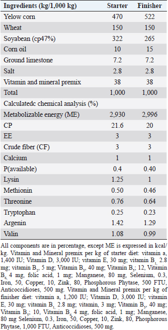 AbstractBackground: Modern intensive poultry production has achieved phenomenal improvement in order to produce high quality chickens by the removal of antibiotics as growth promoters from poultry diets. Instead, numerous additives, such as probiotics, prebiotics, organic acids, enzymes, and phytogenics, are extensively used in poultry feed. Aim: This study was conducted to investigate the effect of different levels of coriander (Coriandrum sativum) seed powder as a growth promoter on feed intake (FI), live body weight, weight gain, feed conversion ratio, carcass yield, and blood profile in broiler chickens. Method: A total of 240 (Ross 308) one-day-old broiler chicks of mixed sexes were allocated randomly into four treatment groups, with 60 chicks per group. Each treatment group had three replicates (20 chicks per replicate), according to a completely randomized design for 45 days. The chicks were fed diets containing 0% (T1) as control, 1.5% (T2), 2.5% (T3), and 3.5% (T4) of coriander seed powder. The FI, live body weight, and weight gain were monitored and measured on a weekly basis. Blood samples were collected on day 45 of the trial for the determination of the percentage of white blood cells and to assess the blood profile. Results: It was revealed that the growth performance was not significantly affected (p > 0.05). However, the dressing percentage without the skin was significantly increased (p < 0.05) at level 1.5%, while the heart weight was significantly augmented (p < 0.05) at 2.5%, when compared to the control group. Furthermore, the serum triglyceride was significantly reduced (p < 0.05) at 1.5%, while the high-density lipoprotein was significantly increased (p < 0.001) at level 1.5% when compared with the control and 3.5% groups. Moreover, the glutamic oxaloacetate transaminase and glutamate pyruvate transaminase were significantly increased at 3.5% when compared with the control and 1.5% groups, with p < 0.01 and p < 0.05, respectively. The basophil and eosinophil cells count were significantly increased at 2.5% (p < 0.05 and p < 0.01), respectively, while the lymphocyte cell was significantly increased at 1.5% (p < 0.01). Nevertheless, the heterophil cell and H/L were significantly reduced at 1.5% (p < 0.05). Conclusion: Based on the results of this study, the inclusion of coriander seed powder at 1.5% had a positive impact on the dressing percentage without skin, biochemical blood profile, and immune response. Keywords: Blood parameter, Broiler chicken, Coriander, Performance. IntroductionThe use of aromatic plants has been an important part of achieving modern intensive poultry production (Ghazanfari et al., 2015), due to their multiple positive effects on the health (Hashemi and Davoodi, 2010) through stimulation of appetite and feed intake (FI), the improvement of digestive enzyme secretion, activation of immune response (Rahimiet al., 2011), antibacterial properties (Patel and Vakilwala, 2016; Sambasivaraju and Fazeel, 2018), and antioxidant activity (Pathak et al., 2011). Phytogenics have been used as flavors, food preservatives, and medicines (Applegate et al., 2010). Coriander (Coriandrum sativum L.) is a member of the Apiaceae family, native to the eastern Mediterranean region and southern Europe, and it is regarded as both herb and spice and reputedly has health advantages (Zeb, 2016). It has been used in medicine for thousands of years (Nadeem et al., 2013). Certain parts of this plant, such as the leaves, flowers, seeds, and fruits, are rich in beneficial phytonutrients, including linalool (67.6%), which is an important one, monoterpene alcohol, camphor (4.4%), α-pinene (7.1%), and terpinene gamma by the manufacturing company Hamodi et al. (2010). Linalool essential oils possess anthelmintic, antifungal, antioxidant, antimicrobial properties (Silva et al., 2011; Saleh et al., 2014). Furthermore, it has an appetizing and stimulatory effect in the digestion process, which improves the growth performance. The aim of this study was to investigate the effect of the application of different levels of coriander seeds on the performance, hemato-biochemical, and immune responses of broiler chickens. Material and MethodsChicks and experimental designsA trial was carried out at the Medical Clinic, Department of Physiology, Biochemistry and Nutrition, Faculty of Veterinary Medicine, University of Tripoli. The trial was designed according to a completely randomized design. A total of 240 1-day-old broiler chickens of mixed sexes of the commercial Ross 308 strain were used in this study. The initial body weight of each chick was taken, recorded, and randomly allocated into four treatment groups 2 days after the chicks arrived, known as the acclimatization period. Each treatment group comprised 60 chicks distributed into three replicates, where each replicate involved 20 chicks, having an equal number of both sexes, reared in clean pens fitted with deep litter under a standard hygienic condition for 45 days. Diets and husbandryTwo experimental diets (starter and finisher) were used in this trial. They were set by Al-Maraie Company according to the National Research Council (NRC) regulations (1994) and standard to meet the chickens’ daily requirements. The ingredients and chemical composition of the experimental diets are presented in Table 1. The chicks were fed a starter diet for the first 18 days, followed by a finisher diet for the rest of the trial (18–45 days). The coriander seeds were passed through a 2-mm sieve hammer mill and placed into labeled plastic bags and mixed with the basal diets at the rate of 0% (T1) as control, with no supplement, 1.5% (T2: 150 g coriander plus 9.850 kg of basal diet in total mixture of 10 kg), 2.5% (T3: 250 g coriander plus 9.750 kg of basal diet in total mixture of 10 kg), and 3.5% (T4: 350 g coriander plus 9.650 kg of basal diet in total mixture of 10 kg) using an electric concrete mixing machine. At the same time, a small porti