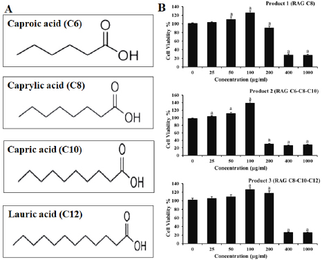 Fig. 1. (A) Chemical structures of MCFA derivatives. (B) The effects of MCFAs on PAMs cell at the cell viability by MTT assay. Data are presented as the mean ± SEM of three independent experiments indicate the significant differences between the control and treatment groups was determined by one-way analysis of variance (a: p < 0.05). Statistical analysisStatistical analysis was performed using IBM SPSS software (SPSS 23.0 for Windows; IBM, Chicago, IL). A p-value < 0.05 was considered to be statistically significant. Differences among the groups were tested by Duncan’s multiple comparison methods. Ethical approvalThe study was conducted in compliance with the institutional rules for the care and use of laboratory animals and using a protocol approved by the Ministry of Agriculture and Rural Development Vietnam (TCVN 8402:2010). Results and DiscussionASF is one of the most important viral diseases of wild boar and domestic pigs, causing significant socio-economic losses in affected countries (Dixon et al., 2019a). Depending on host characteristics and the circulating viral isolate, clinical signs may vary from the highly lethal form with 100% mortality to sub-clinical and a clinical form (Chenais et al., 2019; Cwynar et al., 2019; Dixon et al., 2019a, 2019b). Since the developed vaccines against ASFV have failed to induce effective protection, it is reasonable to evaluate antiviral agents against this virus (Revilla et al., 2018; Gaudreault and Richt, 2019; Sanchez et al., 2019). The aim of this study focused on (i) characterization of ASFV strain isolated from the capital Hanoi outbreak in the Red River Delta region of Vietnam and (ii) investigation of the antiviral activities of MCFAs at different composting materials, including C8 (caprylic acid), caprylic acid-caproic acid-capric acid (C8-C6-C10) and C8-C10-C12 (caprylic acid-capric acid-lauric acid), against ASFV infection in vitro. We first screened the cytotoxicity of MCFAs on PAM cells, the permissive cells for ASFV infection in vitro, by using the MTT assay according to the manufacturer’s protocols. As shown in Figure 1B, at the dose of 200 μg/ml, products 1 and 3 have shown a less cytotoxic effect when compared to product 2 on PAM cells, suggesting the anti-proliferative effects of the C6 component in product 2. All products do not induce cytotoxicity at the dose of 100 μg/ml (Fig. 1B), suggesting that all products are suitable for further in vitro examination. It has been reported previously that C6 and capric acid (C10) compounds at low concentrations may cause an alteration in cell membrane structures. However, the cytotoxic effects on mammalian cells may not reflect the adverse effects in humans and animals because of many physiological factors, including mucins and serum (Zentek et al., 2011). To examine antiviral effects of chemical/disinfectants, information of viral field strain used in whole experiments is very important, including genetic characterization. An ASFV isolated from an outbreak in the Capital Hanoi of Vietnam was employed. Some virus assays, including virus isolation in combination with HAD assay and conventional PCR for genotyping and serotyping, have been performed to confirm this field strain. A strong positive HAD was observed in culture, indicating the success of viral isolation (Fig. 2A). This isolate was named Pig/Hanoi/2019/01. Further conventional PCR was conducted to verify HAD positive data as recommended by OIE and genetic characterization of Pig/Hanoi/2019/01 based on the sequencing analysis of the p72, CD2v, and TRS region gene. As expected, positive 478-bp, 816-bp, and 356-bp bands of PCR products were appeared on the gel, respectively (Fig. 2B). Nucleotide sequence comparisons using the Basic Local Alignment Search Tool (http://blast.ncbi. nlm.nih.gov/Blast.cgi) revealed that the p72 and CD2v sequences of Pig/Hanoi/2019/01were 100% identical to those of China isolates of ASFV SY18, Pig/HLJ/2018, AnhuiXCGQ, and CN201801 (Ge et al., 2018; Li et al., 2018; Zhou et al., 2018). Phylogenetic analysis of p72 and CD2v of epidemic ASFV strain, Pig/Hanoi/2019/01, demonstrated that this isolate belongs to genotype II and serotype 8 and closely related with ASFVs isolated from China in 2018 (Zhou et al., 2018), Russia in 2012 and 2017 (Kolbasov et al., 2018) and Estonia 2014 (Zani et al., 2018) (Fig. 3A and B). On the other hand, the TRS regions in the intergenic region (IGR) between I73R and I329L has been extremely useful for resolving epidemiologic complexities at the genotype, region, and country levels (Gallardo et al., 2014; Sanna et al., 2017; Quembo et al., 2018), such that additional genome markers are required to evaluate the origin and to map the outbreak of closely related ASF isolates circulating in Viet Nam. Our results showed that the Pig/Hanoi/2019/01strain had an intergenic region II variant with an additional 10 nucleotide (5′-GGAATATATA-3′) into the TRS region between the I73R and I329L genes (Fig. 3C). The intergenic region II variant of the Pig/Hanoi/2019/01strain was identified to those described in isolates Ukr12/Zapo, Belgium 2018/1 (Sanna et al., 2017). The same TRS insertion was also found in China isolates of ASFV SY18, Pig/HLJ/2018, AnhuiXCGQ, and CN201801 (Ge et al., 2018; Li et al., 2018; Zhou et al., 2018) and differ from ASFV isolated in Georgia in 2007 (Chapman et al., 2011). The sequences of p72, CD2v, and TRS genes of Pig/Hanoi/2019/01 strain have been deposited in GenBank as the accession numbers of MT332151-3, respectively. Up until now, at least two different variants of IGR located between the I73R and I329L genes of ASF virus strains in Vietnam have been reported, and most ASFV strains circulating in this country belong to the p72 genotype II and IGR II variant (Tran et al., 2021). Therefore, the pig/Hanoi/2019/01 strain has been selected for this study as a representative strain of ASFV circulating in Vietnam. Recent research suggested that the suscep