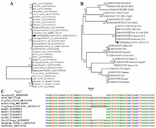 Fig. 3. Phylogenetic analysis of Pig/Hanoi/2019/01 based on its partial p72 (A), EP402R gene encoding the CD2v protein (B) genes. The sequences of the p72 and EP402R gene encoding the CD2v protein genes of representative ASF virus were downloaded from the NCBI database. The neighbor-joining method was used to construct phylogenetic trees using MEGA 7 software. Numbers along branches indicate bootstrap values >70% (1,000 replicates). The black square indicates the ASF virus isolate from this study. Scale bars indicate nucleotide substitutions per site. (C) Alignment of the partial nucleotide sequence of the intergenic region between I73R and I329L of ASFV strain isolated from the capital Hanoi of Vietnam with reference ASFV strains. The mutation that results in the insertion of a single nucleotide internal repeat sequence (GGAATATATA) in the Pig/Hanoi/2019/01 is indicated by gray shading.