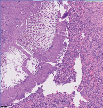 Fig. 1. Plant foreign body was embedded within the suppurative inflammation of the ventral bladder wall’s muscularis layer. The inflammation is associated with reactive fibrosis and peripheral lymphofollicular aggregates. Peripheral portions of the inflammation also have heavy aggregates of hemosiderosis and multifocal acute hemorrhage. Lesion 2 as seen in Figure 2, there is a segmental area of mucosal thickening with surface ulceration. Coalescing nests of transitional epithelia extend into the underlying superficial submucosa; transitional cells have abundant eosinophilic cytoplasm with distinct cell borders, ovoid-round nuclei with finely stippled chromatin and moderate anisokaryosis and rare mitotic figures. One of the four reviewing pathologists suggested this could be a possible low-grade urothelial carcinoma with a curative clean margin excision. The poodle had a generally uneventful recovery with his urination frequency gradually returning to a normal pattern over 2 months post-surgery (timeline matched the surgeon’s expectations). At 6 weeks post-op, he did experience an episode of superficial yeast infection on his back due to the diapers he had been wearing in the weeks immediately after surgery. The yeast infection (“diaper rash”) was in the area that had been shaved during surgery to excise 2 collections of canine papillomas. A 2-week course of topical antibacterial/antifungal preparation (SkinGuard Restore Mousse; Ceva Animal Health, Lenexa, KS; active ingredients chlorhexidine gluconate 3%, climbazole 3%, and phytosphingosine salicyloyl 0.05%) resolved the infection, associated with cessation of diaper usage.