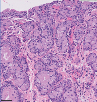 Fig. 2. Segmental area of mucosal thickening with surface ulceration. Coalescing nests of transitional epithelia extend into the underlying superficial submucosa; transitional cells have abundant eosinophilic cytoplasm with distinct cell border, ovoid-round nuclei with finely stippled chromatin and moderate anisokaryosis and rare mitotic figures. Possible low grade urothelial carcinoma with a curative clean margin excision. DiscussionPlant awns can invade animals’ bodies by means of the awn’s barbed tips with serrations, allowing progressive infiltration into an animal via many entry points, including from their fur/hair into their skin, inhalation (sinus, nose), or ingestion (oral cavity). Problematic grasses include the following “mean seeds” (a term coined by Cathy Lewis, meanseeds.com): wild barley (Hordeum murinum) and wild oats (Avena fatua) are problems in Europe, whereas wild rye (both Elymus virginicus and Elymus canadensis) and foxtail grass (many species share this name, including Alopecurus, Bromus madritensis, Hordeum jubatum, and Setaria) are problematic in the US and Canada (Lauenroth, 2013; Flisi et al., 2018). Many cases in the literature are in hunting dogs or other animals regularly exposed to plants that have awns capable of penetrating skin. The case described here is a different setting, that of a sedate 15-year old poodle living a suburban existence yet who ended up with a plant foreign body embedded in the bladder mucosa and who has an uncertain exposure history as well as entry point for the awn. The dog did undergo at least 2 cystocentesis procedures and a splenic resection in the 2 years before the awn was diagnosed but it seems unlikely the awn was introduced iatrogenically during one of those procedures. Most likely the dog encountered the mean seed on a walk and then the awn attached itself to the dog’s hair around his penile opening and advanced up the urethra and, instead of the many cases in the literature where awns either got embedded in the urethra itself or got into the bladder and formed stones, the awn got embedded in the bladder wall. The ultrasound findings of this case, in particular, the hypoechoic nature of the bladder nodules, is different from some other published reports of embedded awns which were frequently reported as hyperechoic or a mixture of hypo- and hyperechoic regions. Cherbinsky et al. (2010) reported on 2 dogs and 1 cat who had intravesical awns that all had a hyperechoic ultrasound appearance; 1 dog with an awn embedded in the urethra had hyperechoic walls but a hypoechoic lumen. Citi et al. (2017) reported on two dogs with awn-induced pancreatitis. One dog had a hypoechoic area between the right liver lobe and right pancreatic lobe and a vegetal foreign body described as a 5 cm linear branched hyperechoic structure with a dense acoustic shadow was located within the hypoechoic area. Another case report of a dog with an awn in the prostate had ultrasound evidence of a linear hyperechoic structure in the prostatic parenchyma surrounded by a hypoechoic/anechoic area (correlating to a local inflammatory response) (Marchesi et al., 2020). While rare, this case points out the importance of including foreign bodies from embedded plant awns in the differential diagnosis of intramural lesions in the bladder. AcknowledgementsThe staff at Madison Animal Hospital (Madison, NJ) including Gregory Erdman, VMD, and Barbara Day, DVM; the staff at Red Bank Veterinary Hospital (Tinton Falls, NJ) including Andrew Weissman, VMD (radiology), Elena Kabatchnick, DVM (internal medicine), Ryan Ford, VMD (surgery); EJ Ehrhart, DVM, PhD (Zoetis Reference Laboratories, Louisville, KY). Conflict of interestThe author declares that there is no conflict of interest. ReferencesAppel, S.L., Lefebvre, S.L., Houston, D.M., Holmberg, D.L., Arnold Stone, J.E., Moore, A.E.P. and Weese, J.S. 2008. Evaluation of risk factors associated with suture-nidus cystoliths in dogs and cats: 176 cases (1999–2006). J. Am. Vet. Med. Assoc. 233, 1889–1895. Brennan, K.E. and Ihrke, P. J. 1983. Grass awn migration in dogs and cats: a retrospective study of 182 cases. J. Am. Vet. Med. Assoc. 182, 1201–1204. Burgisser, H. and Hintermann, J. 1967. Cerebral damages due to foreign bodies from the nasal cavity in the dog. Schweiz. Arch. Tierheilkd. 109, 537–538. Cherbinsky, O., Westropp, J., Tinga, S., Jones, B. and Pollard, R. 2010. Ultrasonographic features of grass awns in the urinary bladder. Vet. Radiol. Ultrasound. 51, 462–465. Citi, S., Mannucci, T., Pedala, F., Vannozi, I. and Vignoli, M. 2017. Acute pancreatitis associated with peritoneal migration of grass awn in two dogs. Acta Vet. 67(4), 587–592. Combs, M., Hicks, A., Young, P., Gibbons, G., Lord, J., Edwards, G., Golland, D., Michelsen, J., Raidal, S., Davies, S. and Malik, R. 2017. Grass seed foreign body-related disease in dogs and cats: a wide spectrum of clinical presentations. Aust. Vet. Pract. 47, 13–24. Del Angel-Caraza, J., Pérez-García, C.C., Bende, B., Diez-Prieto, I. and García-Rodríguez, B. 2011. Mouse barley awn (Hordeum murinum) migration induced cystolithiasis in 2 male dogs. Can. Vet. J. 52, 67–69. Dennis, M.M., Pearce, L.K, Norrdin, R.W. and Ehrhart, E.J. 2005. Bacterial meningoencephalitis and ventriculitis due to migrating plant foreign bodies in three dogs. Vet. Pathol. 42, 840–844. Flisi, S., Dall’Aglio, M., Spadini, C., Silvia Cabassi, C. and Quintavalla, F. 2018. Microbial isolates from vegetable foreign bodies inhaled by dogs. Vet. Med. Int. 2018, 1–9; doi:10.1155/2018/3089282 Lauenroth, W. 2013. Podcast with transcript for American Kennel Club’s Canine Health Foundation. Grass awn migration disease, handout on AKC website. Available via https://www.akcchf.org/educational-resources/podcasts/podcast-transcripts/Dr-Bill-Lauenroth-Grass-Awn-Migration-Disease.pdf (Accessed 12 April 2021). Marchesi, M.C., Moretti, G., Angeli, G., Birettoni, F., Porciello, P., Bufalari, 