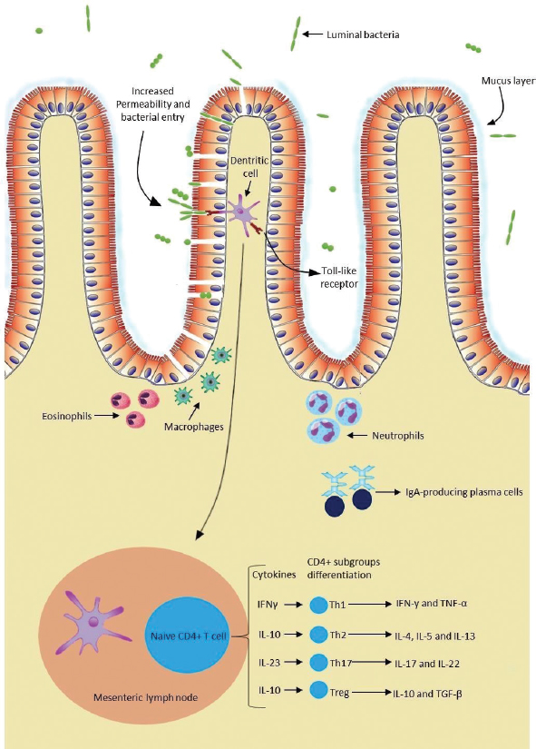 Fig. 1. The intestinal immune system in canine chronic inflammatory enteropathies. The intestinal barrier has increased permeability in dogs with CIE. An impaired barrier function can increase the exposure of immune cells to luminal antigens. These can be tolerated or reacted against, based on the PRRs, such as TLRs. Innate response is based on the interaction of IECs, neutrophils, macrophages, DCs, and eosinophils, as well as their secreted products. After innate immunologic mechanisms, activated APCs trigger an adaptive immune response by presenting peptide antigens to naïve CD4+ T helper cells in secondary lymphoid organs, such as the mesenteric lymph node. Based on their cytokine profile, Th cells can be differentiated into Th1, Th2, Th17 cells, and Tregs, and consequently produce their respective cytokines. In addition, intestinal B lymphocytes have the ability to turn into plasma cells and produce IgA antibodies, which contribute to immune protection. (Original illustration based on: Abraham and Cho, 2009; Allenspach, 2011; Eissa et al., 2019). After innate immunologic mechanisms, activated antigen-presenting cells (APCs) trigger an adaptive immune response by presenting peptide antigens to naive CD4+ T helper cells (Th cells) in secondary lymphoid organs. Based on their cytokine profile, Th cells can be differentiated into Th1 cells, which mediate cytotoxicity and cell-mediated immunity; Th2 cells, which mediate humoral immunity; and Th17 cells or regulatory T cells (Tregs) (Heilmann and Suchodolski, 2015). On top of that, memory lymphocytes are also developed (Abraham and Cho, 2009). In canine CIE, intestinal inflammation can be marked by Th1 responses, which are mediated mainly by the secretion of interferon gamma and tumor necrosis factor alpha. Th1 cells can be antagonized by Th2 cells that primarily produce interleukin (IL)-4, IL-5, and IL- 13, and are typically associated with responses to allergens and parasites (Eissa et al., 2019). Other studies have not been able to demonstrate a clear Th1 or Th2 cytokine expression in dogs with CIE (Jergens et al., 2009; Kołodziejska-Sawerska et al., 2013; Dumusc et al., 2014; Heilmann and Suchodolski, 2015; Eissa et al., 2019). Experts in the field observed that IL-23p19 is increased in the inflamed intestinal mucosa of dogs. This cytokine is produced by macrophages and plays an important role in the promotion of Th17 cell differentiation (Tamura et al., 2014). Th17 cells can produce proinflammatory cytokines, such as IL-17 and IL-22, but most importantly they can demonstrate anti-inflammatory properties due to their ability to transdifferentiate into Tregs. These cells play an important role in maintaining immunotolerance. They are in charge of suppressing effector T cells and APCs through the secretion of immunosuppressive cytokines, such as IL-10 and transforming growth factor beta (Maeda et al., 2016; Heilmann and Steiner, 2018; Eissa et al., 2019). In dogs with CIE, this imbalance between proinflammatory and anti-inflammatory cytokines results in disrupted intestinal immunity (Kołodziejska-Sawerska et al., 2013). Although Th1, Th2, and Th17 are crucial for the defense against pathogens and elevated intake of luminal bacteria, their extension and overactivity can result in intestinal inflammation (Abraham and Cho, 2009). In addition, intestinal B lymphocytes have the ability to turn into plasma cells and produce immunoglobulin (Ig) A antibodies, which contribute to immune protection without causing inflammation (Abraham and Cho, 2009). IgA antibodies not only contribute to the prevention of bacteria crossing the epithelial barrier, but can also shape the intestinal microbiota composition (Maeda et al., 2013), keeping them from triggering an immune response in the intestine (Lee et al., 2015). Current diagnostic challengesThe diagnosis of CIE requires a complete investigation in order to exclude other possible causes of GI signs (Heilmann and Steiner, 2018; Moser et al., 2018), including infectious, neoplastic, metabolic, or endocrine diseases (Moser et al., 2018). This includes a detailed medical history, clinical examination, complete blood cell count, serum biochemical analyses, parasitological and bacteriologic fecal analyses, pancreatic function tests, medical imaging, including radiography and abdominal ultrasonography, which give information about intestinal layering and wall thickness. Furthermore, to acquire more specific information on the intestinal inflammation, an endoscopic evaluation with intestinal biopsies and histopathological evaluation, which distinguishes the various subtypes of mucosal infiltration, should be conducted (Cerquetella et al., 2010; Wdowiak et al., 2013; Allenspach, 2015; Moser et al., 2018). The interpretation of the obtained biopsies contributes to the assessment of the severity and distribution of the disease (Moser et al., 2018). Clinical signs result from uncontrolled inflammation (Dandrieux, 2016) and generally include abdominal pain, vomiting, diarrhea, anorexia, weight loss, flatulence, bloating (Eissa et al., 2019), inappetence, and borborygmi (Kalenyak et al., 2018). Important tools for clinical evaluation are the canine IBD activity index (CIBDAI) and the canine chronic enteropathy clinical activity index (CCECAI) (Cerquetella et al., 2010). The former evaluates six parameters including attitude/activity, appetite, vomiting, stool consistency, stool frequency, and weight loss. Each variable is scored from 0 (normal) to 3 (severe change). Based on a cumulative score, it classifies the disease as insignificant (0–3), mild (4–5), moderate (6–8), or severe (≥9) (Jergens et al., 2003). The above-mentioned clinical signs are also considered in CCECAI, together with albumin concentration, the presence of ascites, peripheral edema and pruritus. Based on a similar scoring pattern, CCECAI classifies the disease as insignificant (0–3), mild (4–5), moderate (6–8), severe (9–11), a