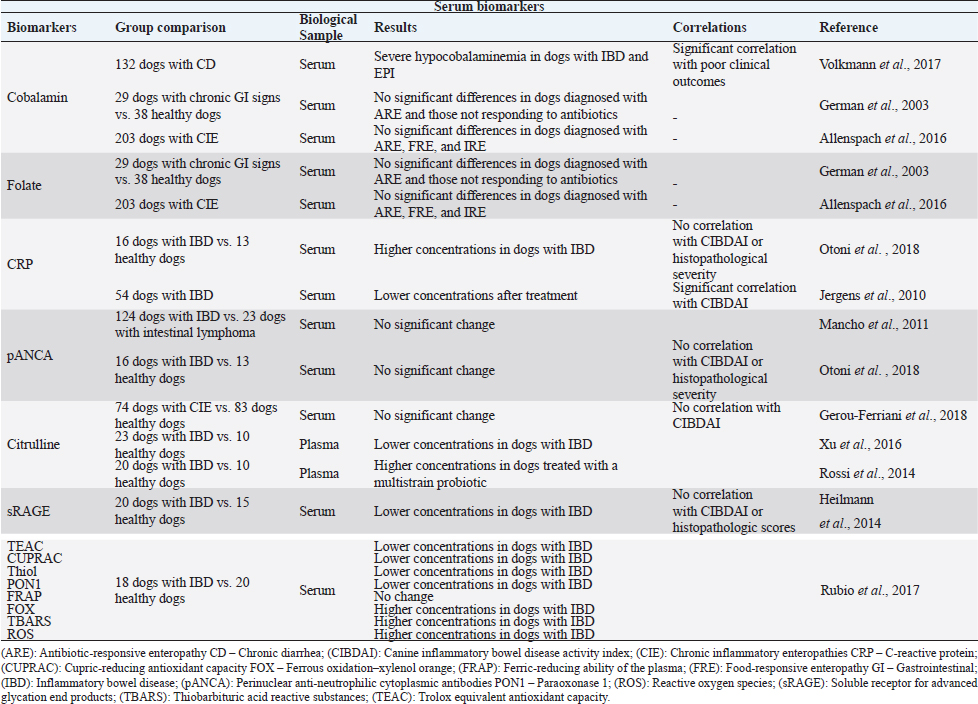 It is worth noting that the endoscopic evaluation of the intestinal mucosa and histopathologic findings are usually not sufficient in differentiating the various forms of CIE (Heilmann and Steiner, 2018). However, these tools remain the golden standard for detecting and quantifying intestinal inflammation (Collins, 2013). Endoscopy procedures are costly, time-consuming (Heilmann et al., 2014), and influenced by operator experience. Additionally, these are relatively invasive procedures (Otoni et al., 2018) that require general anesthesia, and the preparation of the colon. Histopathological examination of GI inflammation might be considered as limited, as clinical outcomes can be influenced by several factors. Among those are biopsy procedure, number of tissues samples, biopsy sample quality, and the diverse interpretations of GI histopathological findings among pathologists (Day et al., 2008; Simpson and Jergens, 2011; Wdowiak et al., 2013; Allenspach et al., 2018). The World Small Animal Veterinary Association (WSAVA) GI Standardization Group developed a grading scheme about histopathological standards for the characterization of inflammatory and associated morphological abnormalities in the canine and feline GI tract, in order to reduce fluctuations among interpretations (Day et al., 2008). However, even with the use of the WSAVA’s standardization grading scheme, significant interobserver variability in the diagnostic interpretation of endoscopic mucosal specimens still exists (Allenspach, 2015; Allenspach et al., 2018), as well as lack of consensus (Simpson and Jergens, 2011). Another limitation to consider is the fact that improvement of the histopathologic lesions does not always correspond to the response to therapy and clinical improvement (Collins, 2013; Heilmann et al., 2016). These procedures are unlikely to be frequently carried out (Heilmann et al., 2014). Furthermore, there are no currently available systems to accurately assess the degree of active inflammation. Considering all these constraints, there is a need for a simple, minimally or non-invasive, and objective method that evaluates intestinal inflammation (Collins, 2013). Thus, biological markers for clinical indices, which objectively reflect mucosal disease severity, might be useful in clinical practice in diagnosing and managing GI inflammation (Heilmann et al., 2014; Otoni et al., 2018). It could be considered an attractive option for estimating a diagnosis, prognosis, and defining disease severity (Wdowiak et al., 2013; Otoni et al., 2018). Clinical relevanceAccording to the European Commission Health Research Directorate (2010), “A biomarker is a biological characteristic, which can be molecular, anatomic, physiologic, or biochemical. These characteristics can be measured and evaluated objectively. They act as indicators of a normal or a pathogenic biological process. A biomarker shows a specific physical trait or a measurable biologically produced change in the body that is linked to a disease or a particular health condition”. In CIE, biomarkers can be very useful tools in identifying the presence of disease, site of origin, evaluating the GI function, determining the progression of the disease, as well as the current response to treatment, and monitoring the severity of GI inflammation. In the past decade, diverse biomarkers have been evaluated in dogs with CIE. In clinical practice, a useful biomarker should have the characteristics that make it valuable (Heilmann and Steiner, 2018). In order to have an added value, a biomarker should aim to be measurable without temporal delay in expression or secretion, specific to the disease process (Heilmann et al., 2014), easy to perform, have the ability to accurately identify individuals at risk (Jergens and Simpson, 2012), affordable, and minimally invasive, as well as being stable in routine biological samples (Heilmann and Steiner, 2018). In clinical practice, when using a single biomarker, it is essential to understand that it is improbable to meet all the criteria. Hence, clinical information about a specific biomarker should be taken into account for a better understanding of the data in a specific clinical situation (Heilmann and Steiner, 2018). The biomarkers addressed in this study may be serological, present in urine and feces, or even tissue-derived (Wdowiak et al., 2013). A summary of the clinical trials findings is presented in Tables 1 and 2. Biomarkers in chronic inflammatory enteropathiesSerological biomarkersCobalamin and folate concentrations. Cobalamin (vitamin B12) and folate (vitamin B9) are water-soluble vitamins (Heilmann and Steiner, 2018) of diagnostic and therapeutic importance (Collins, 2013). Most commercial pet foods usually contain cobalamin and folate, thus a dietary deficiency is very uncommon (Berghoff and Steiner, 2011). Some breeds, such as Chinese Shar Peis, Giant Schnanuzers, Border Collies, and Beagles, have cobalamin deficiency. Besides genetic predisposition, other causes for cobalamin deficiency in dogs are CIE and EPI (Toresson et al., 2016). Hypocobalaminemia is more likely to occur due to disturbances in its absorptive mechanism. In the diet, cobalamin is bound to animal protein, preventing it from being absorbed. In the stomach, protein is partly digested. As a result, cobalamin is released and immediately binds to the R-binding protein. When entering the small intestine, pancreatic proteases breakdown the R-binding protein and the liberated cobalamin has high affinity to the intrinsic factor (IF), which is mainly secreted by the pancreas. After binding to IF, this complex is later absorbed into the ileum, the distal part of the small intestine by specific receptors (Berghoff and Steiner, 2011; Toresson et al., 2016). Several factors can disturb this mechanism, resulting in cobalamin malabsorption. Chronic inflammation of the ileal mucosa can cause a reduced expression of the cobalamin-IF receptors in enterocytes (Be
