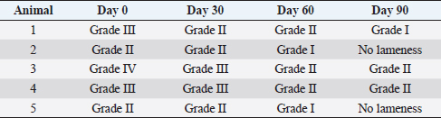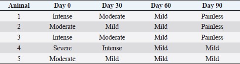 After therapy, the animals did not reveal any clinical improvement and, during a 6-months period, they had not undergone any pharmacological or physical rehabilitation procedures. PRP therapyThe osteoarthritic joints of the five studied animals were targeted for allogeneic PRP therapy. The PRP gel was provided by Vetherapy (Coimbra, Portugal). In order to obtain PRP, venous blood was collected in a 250-ml transfusion bag with citrate phosphate dextrose. The blood samples were sent to the laboratory and were analyzed to make sure animals were vaccinated. Within 12 hours, the blood samples were processed under Vetherapy’s proprietary protocol by the dual centrifugation technique (one low-speed and one high-speed centrifugation) with the standardization of platelet counts per ml (minimum of 1 million platelets per microliter). The obtained PRP was pooled together, stored and frozen, and sent to Arrábida Veterinary Hospital in 1.5-ml vials on dry ice. In all the dogs from which blood was obtained using an allogeneic approach, echoguided intraarticular PRP injection was administered under sedation with a combination of 0.2 mg/kg of midazolam, 0.2 mg/kg of methadone, and 0.6 mg/kg of propofol, intravenously and after aseptic field preparation (Fig. 2). After this procedure, the animals were evaluated after 30, 60, and 90 days. Statistical analysisThe data obtained were subject to descriptive statistical analysis that included the calculation of absolute and relative frequencies, means, and standard deviation using the Microsoft Office Excel 2013 software (Microsoft, United States of America). Ethical approvalThere were no ethical issues to address. ResultsIt can be seen that all animals improved after 90 days of treatment. In this scenario, two clinical parameters were evaluated: the grade of lameness on days 0, 30, 60, and 90 (Table 2) and the score of pain on days 0, 30, 60, and 90 (Table 3). All animals showed a decrease in lameness grade after 90 days. Animal 2, after day 90, presented a normal gait. The two animals with grade III lameness, after 90 days of PRP administration, improved for grades I and II, respectively. The two animals that presented grade II lameness evolved to grade 0, i.e., without lameness. The only animal with grade IV lameness, after PRP application decreased to a grade II. For pain evaluation, there were positive results, with the first three animals becoming painless, while animals 4 and 5 went from having severe and moderate pain to mild pain after day 90, respectively.