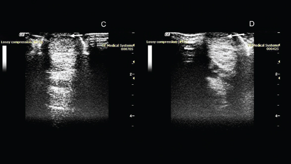 Fig. 2. Ultrasonography of the superficial digital flexor. (C): 50th day after the introduction of plasmid DNA. (D): 80th day after the introduction of plasmid DNA.