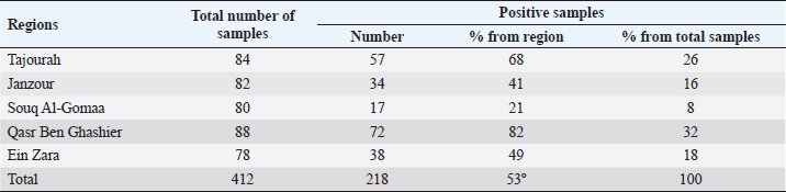 Real time RT-PCR (rRT-PCR)RNA was extracted from all tracheal and cloacal samples by RNA Isolation Kit ME-0010/ME-0012 ZJ., Biotech and QIAamp Viral RNA Mini extraction Kit, QIAGEN as per the manufacturer’s instructions. After extraction of RNA, samples were examined for APMV-1 by rRT-PCR using a commercial kit (AnDiatec, Kornwestheim, Germany) and using the real-time protocol as previously described (Cattoli et al., 2009). Serological test of NDV using indirect ELISACollected sera were tested for the presence of specific antibodies against NDV by ELISA commercial kit (CK116 NDV, BioChek, B.V, The Netherlands). The test was performed as per the manufacturer’s instructions. Statistical analysisPrevalence of ND in different regions and seasons was compared using Chi-square test (SPSS Inc. Chicago, IL). The value of (p < 0.01) was taken as the cut-off value to consider differences statistically significant. ResultsrRT-PCR results for NDVData pertaining to the detection of NDV in backyard chickens and ducks during summer season (June) and early winter (November) as well as the locations are shown in Table 2 and Figure 1. The prevalence of NDV infection in backyard chickens in different locations of Tripoli during summer and winter was 45% using rRT-PCR. In summer, 104 (55%) out of 190 cloacal samples collected from chickens, were positive to NDV. The positive samples were distributed as 60 (92%), 30 (88%), and 14 (58%) from Qasr Ben Ghashier, Al-Sawani and Tajourah, respectively. In the early winter, 21 (23%) out of 90 samples collected from backyard chickens were found positive to NDV. The positive samples were distributed as 13 (93%), 5 (23%), and 3 (9%) from Qasr Ben Ghashier, Al-Sawani and Tajourah, respectively. The prevalence in summer season was significantly higher than in winter (X2=46.13, p ≥ 0.00001). However, there were no significant differences in the prevalence of ND in Qasr Ben Ghashier in both seasons. Samples collected from Janzour, Souq Al-Gomaa, and Ein Zara in summer and winter were negative to NDV. Serological test results of NDV using indirect ELISAData pertaining to detection of antibodies against NDV by indirect ELISA are presented in Table 3 and Figure 2. ELISA test revealed 218 positive out of 412 tested samples with total prevalence of 53% across the city of Tripoli in all regions. Obviously, Qasr Ben Ghashier has presented the highest prevalence of NDV specific antibodies (82%) followed by Tajourah (68%). The prevalence in Qasr Ben Ghashier was significantly higher as compared with other regions (X2=74.09, p ≥ 0.00001). The prevalence of 49% and 41% were recorded in Ein Zara and Janzour, respectively. The lowest prevalence was recorded in Souq Al-Gomaa (21%).
