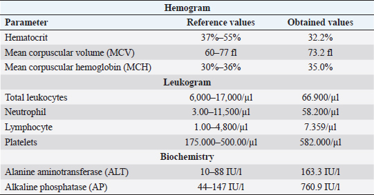 | Pubmed Style Gorza L, Oliveira A, Porto M, Santos V, Hardt I, Maestri L, Domingues T, Flecher M. Clinical, anatomopathological and immunohistochemical findings of a transitional cell carcinoma from nasal cavity, frontal and ethmoidal sinus with meningoencephalic invasion in a dog. Open Vet. J.. 2021; 11(1): 1-5. doi:10.4314/ovj.v11i1.1 Web Style Gorza L, Oliveira A, Porto M, Santos V, Hardt I, Maestri L, Domingues T, Flecher M. Clinical, anatomopathological and immunohistochemical findings of a transitional cell carcinoma from nasal cavity, frontal and ethmoidal sinus with meningoencephalic invasion in a dog. https://www.openveterinaryjournal.com/?mno=8889 [Access: January 25, 2026]. doi:10.4314/ovj.v11i1.1 AMA (American Medical Association) Style Gorza L, Oliveira A, Porto M, Santos V, Hardt I, Maestri L, Domingues T, Flecher M. Clinical, anatomopathological and immunohistochemical findings of a transitional cell carcinoma from nasal cavity, frontal and ethmoidal sinus with meningoencephalic invasion in a dog. Open Vet. J.. 2021; 11(1): 1-5. doi:10.4314/ovj.v11i1.1 Vancouver/ICMJE Style Gorza L, Oliveira A, Porto M, Santos V, Hardt I, Maestri L, Domingues T, Flecher M. Clinical, anatomopathological and immunohistochemical findings of a transitional cell carcinoma from nasal cavity, frontal and ethmoidal sinus with meningoencephalic invasion in a dog. Open Vet. J.. (2021), [cited January 25, 2026]; 11(1): 1-5. doi:10.4314/ovj.v11i1.1 Harvard Style Gorza, L., Oliveira, . A., Porto, . M., Santos, . V., Hardt, . I., Maestri, . L., Domingues, . T. & Flecher, . M. (2021) Clinical, anatomopathological and immunohistochemical findings of a transitional cell carcinoma from nasal cavity, frontal and ethmoidal sinus with meningoencephalic invasion in a dog. Open Vet. J., 11 (1), 1-5. doi:10.4314/ovj.v11i1.1 Turabian Style Gorza, Leonardo, Ayisa Oliveira, Maryleide Porto, Vania Santos, Izabella Hardt, Luciana Maestri, Tayse Domingues, and Mayra Flecher. 2021. Clinical, anatomopathological and immunohistochemical findings of a transitional cell carcinoma from nasal cavity, frontal and ethmoidal sinus with meningoencephalic invasion in a dog. Open Veterinary Journal, 11 (1), 1-5. doi:10.4314/ovj.v11i1.1 Chicago Style Gorza, Leonardo, Ayisa Oliveira, Maryleide Porto, Vania Santos, Izabella Hardt, Luciana Maestri, Tayse Domingues, and Mayra Flecher. "Clinical, anatomopathological and immunohistochemical findings of a transitional cell carcinoma from nasal cavity, frontal and ethmoidal sinus with meningoencephalic invasion in a dog." Open Veterinary Journal 11 (2021), 1-5. doi:10.4314/ovj.v11i1.1 MLA (The Modern Language Association) Style Gorza, Leonardo, Ayisa Oliveira, Maryleide Porto, Vania Santos, Izabella Hardt, Luciana Maestri, Tayse Domingues, and Mayra Flecher. "Clinical, anatomopathological and immunohistochemical findings of a transitional cell carcinoma from nasal cavity, frontal and ethmoidal sinus with meningoencephalic invasion in a dog." Open Veterinary Journal 11.1 (2021), 1-5. Print. doi:10.4314/ovj.v11i1.1 APA (American Psychological Association) Style Gorza, L., Oliveira, . A., Porto, . M., Santos, . V., Hardt, . I., Maestri, . L., Domingues, . T. & Flecher, . M. (2021) Clinical, anatomopathological and immunohistochemical findings of a transitional cell carcinoma from nasal cavity, frontal and ethmoidal sinus with meningoencephalic invasion in a dog. Open Veterinary Journal, 11 (1), 1-5. doi:10.4314/ovj.v11i1.1 |
