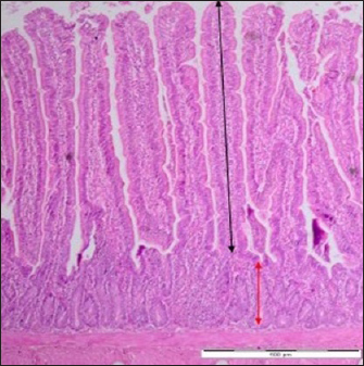 Fig. 1. Villi height and crypt depth of the intestine of SPF chick. Black arrow (villi height) extending along the villi of the duodenum. Red arrow (crypt depth) extending from the base to the villi junction. Control group. Day 7 pi. HE staining. Bar=4 μm (40×). Ethical approvalAll experimental procedures were undertaken in accordance with the Research Policy on Animal Ethics of Universiti Putra Malaysia. ResultsBody weightThe body weight of the chicks in the SE group was fluctuating at the beginning of the experiment. Starting from day 2 pi till the end, every time there was an increase. The body weight in the SE group was lower (p > 0.05) in comparison with the control group before day 2 pi. However, it was also significantly lower (p < 0.05) in comparison with the control group starting from day 2 pi till the end of the experiment (Table 1). The body weight of the chicks in the control group increased continuously starting from hour 12 pi till the end of the experiment. Starting from day 5 pi till the end of the experiment, it was significantly greater (p < 0.05) in comparison with the value in the time before (Table 1). Table 1. Body weight of chick infected with S. enterica (SE PT 1) throughout the 21 days experiment.