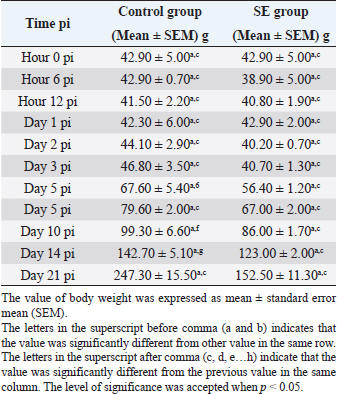 AbstractBackground: The studies about Salmonella infection in newly hatched chicks were not extensive. Aim: The objective of this study was to determine the pathogenicity of Salmonella enterica subspecies enterica serovar Enteritidis (SE) phage type (PT) 1 in one-day-old specific pathogen-free (SPF) chicks. Methods: Seventy, one-day-old SPF chicks, were divided into SE group (30 chicks), mortality group (10 chicks), both orally inoculated (1.0 ml) with SE PT1 (1 × 108 colony-forming unit per 1.0 ml), and one control group (30 chicks). The chicks were sacrificed at 6 and 12 hours, and days 1, 2, 3, 5, 7, 10, 14, and 21 post-inoculation (pi). Samples were collected for bacterial isolation, histological examination, and ultrastructural examination. Results: Starting from day 2 pi, the body weight in the SE group significantly (p < 0.05) decreased. The SE isolation percentages from the liver, spleen, mid-intestinal content, cecal content, cecal tonsil, blood, and cloacal swab were 0.73, 0.77, 0.33, 0.33, 0.36, 0.40, and 0.30, respectively. The isolation percentage in the liver was significantly (p < 0.05) higher than the blood and cloacal swab. The villi heights and crypt depths in the SE group were significantly (p < 0.05) greater and smaller, respectively. Ultrastructurally, erosion and necrosis were observed in the microvilli of the cecal tonsil. The bacteria were engulfed by macrophages at the interepithelial clefts of the M-like M cells. Conclusion: It was concluded that the inoculation of SE PT 1 in one-day-old chicks caused a systemic infection with diarrhea, a decrease in the body weight and villi height in the duodenum, jejunum, and ileum, and high bacterial loading in the liver with mild gross and histological lesions of organs, erosion, and necrosis of microvilli and low mortality. The bacteria entered the body system from the intestinal tract through the interepithelial clefts of the M-like M cells of the cecal tonsil. Keywords: Salmonella enterica, Phage type 1, SPF chicks, Villi and crypt heights, Lesions. IntroductionSalmonella is a causative agent of cross-infection between humans and animals (Ajmera and Shabbir, 2020). It is characterized as a Gram-negative, motile, hydrogen sulfide-producing, an acid-labile facultative intracellular bacterium (Ajmera and Shabbir, 2020). Globally, Salmonella enterica and Salmonella typhimurium represent the major causative agents of human Salmonellosis (Havelaar et al., 2015). The typing of Salmonella is important for the identification of the bacteria, tracing, epidemiological investigation, monitoring antibody susceptibility, food safety, and public health measures. Despite the low resolution, serotyping and multilocus sequence typing (MLST) analyses are considered the standard methods for typing Salmonella (Yan et al., 2021). Based on the phage typing method, Salmonella enterica subspecies enterica serovar Enteritidis (SE) phage type (PT) 1 is a causative agent of human Salmonella infection in Sweden (Nygård et al., 2004), Canada (Khakhria et al., 1991), Italy (Vencia et al., 2015), and Finland (Lukinmaa et al., 1999). However, recently, a high-resolution molecular typing method was established. It was core genome MLST. Such a method underwent whole genomic sequencing for accurate bacterial tracing (Yan et al., 2021). Enteric pathogens, in general, and Salmonella in particular, attach and invade the intestinal epithelium. The infection brings on some adverse consequences to the intestinal function and structure comprising a reduction in the length of the epithelial villi and damage in the intestinal crypts (Bellido-Carreras et al., 2019). This infection initiates activation of the natural killer cells accompanied by intraepithelial T cells. Then, it leads to macrophage infiltration and activation of dendritic cells. Also, there is a proliferation of T cells in the spleen and antibody release in the serum (Meijerink et al., 2021). The studies, about this infection, in newly hatched chicks, were not extensive (McWhorter and Chousalkar, 2019). Thus, the investigation of the infection, with light microscopy and scanning electron microscopy (SEM), would be expected to reveal some consequent influences on the function and architectural physique of the intestine. Moreover, it might uncover some details about the entry mechanism of the microbe and the defensive reaction of the host. The objective of this study was to determine the pathogenicity of SE PT 1 in one-day-old specific pathogen-free (SPF) chicks. Materials and MethodsSalmonella enterica isolateSalmonella enterica was isolated from the liver samples of commercial broiler chickens in Melaka, Malaysia. The method of isolation and identification was described by Kyung-Min et al. (2015). In brief, the samples were collected in Rappaport–Vassiliadis (RV) broth incubated at 37°C for 24 hours and then cultured on both xylose lysin deoxycholate (XLD) and brilliant green (BG) agar at 37°C for 24 hours. The suspected colonies of Salmonella were cultured on urease and triple sugar iron (TSI) biochemical test. Positive cultures from the biochemical test were then identified serologically by Salmonella poly-O antisera using slide agglutination test (SAT). Phage typingPositive SE colonies were characterized by phage typing at the Laboratory of Enteric Pathogens Center for Infections Institute, 61 Colindale Avenue, London, UK by the method described by Demczuk et al. (2003). A loopful of frozen nutrient broth was cultured on nutrient agar at 37°C for 24 hours. Positive colonies were incubated in blood agar (BA) culture at 37°C for 24 hours. The colonies from BA were inoculated into 3 ml of phage broth for 2 hours with vigorous shaking. The phage broth was then poured on a phage agar plate after the removal of excess broth. Next, bacteriophages were left overnight to dry at room temperature. The phage lysis pattern of cultures was evaluated according to Demczuk et al. (2003) scheme. It was ident