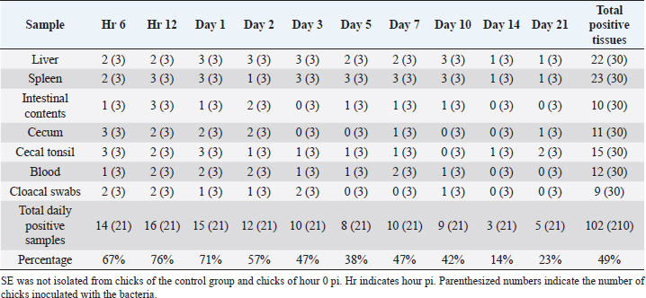Clinical signsIn the SE group, at hour 6 pi, one chick was affected with diarrhea, then diarrhea was observed in all chicks from hour 12 pi till the end of the experiment. From day 2 pi till the end of the experiment, the chicks were affected by inappetence. From day 3 pi till the end of the experiment, there was a sign of ruffled feathers. From day 5 pi till the end of the experiment, there was stunting. In the mortality group, all the chicks were affected with diarrhea from hour12 till the end of the experiment. From day 3 pi till the end of the experiment, there were inappetence, ruffled feathers, and stunting. No abnormal clinical signs were observed in the control group. Gross lesionsIn the SE group, at hours 6, 12 pi, and day 1 pi, gross lesions were not observed. From day 2 pi till the end of the experiment, mild airsacculitis and mild peritonitis were recorded in all chicks. Also, from day 2 pi until day 21 pi, congestion, in the liver and kidney, was observed in some chicks. One chick died on day 3 pi and another chick died on day 5 pi. Dead chicks were affected by dehydration. In the control group, no gross lesions were recorded. Bacterial isolationLiverIn the SE group, SE was isolated at hours 6, 12 pi from the liver tissues (33%). On days 1, 2, and 3 pi, it was isolated 100%. On days 5 and 7 pi, it was isolated at 33%. On day 10 pi, it was isolated 100%. On days 14 and 21 pi, it was isolated at 33% (Table 2). SpleenIn the SE group, SE was isolated at hour 6 pi (66%). At hour 12, days 1, 3, 5, 7, and 10 pi, it was isolated 100%. On days 2, 14, and 21 pi, it was isolated at 33% (Table 2). BloodIn the SE group, SE was isolated at hour 6 pi (33%). At hour 12 pi, it was isolated 66%. On days 1, 2, and 7 pi, it was isolated at 66%. On days 3, 5, and 10 pi, it was isolated at 33%. On days 14 and 21 pi, it was not isolated (Table 2). Mid-intestinal contentIn the SE group, SE was isolated at hour 6 pi (33%). At hour 12 pi, it was isolated 100%. On day 1 pi, it was isolated at 33%. On day 2 pi, it was isolated at 66%. On days 5, 7, and 10 pi, it was isolated at 33%. On day 3 pi, it was not isolated (Table 2). Cecal contentIn the SE group, SE was isolated at hour 6 pi (100%). At hour 12 pi, days 1 and 2 pi, it was isolated at 66%. On days 7 and 21 pi, it was isolated at 33%. It was not isolated on days 3, 5, 10, and 14 pi (Table 2). Cecal tonsilIn the SE group, SE was isolated at hour 6 pi (100%). At hour 12 pi, it was isolated 66%. On day 1 pi, it was isolated 100%. On days 2, 3, 5, 7, and 14 pi, it was isolated at 33%. On day 21 pi, it was isolated at 66% (Table 2). Cloacal swabIn the SE group, SE was isolated at hours 6 and 12 pi (66%). On days 1 and 2 pi, it was isolated at 33%. On day 3 pi, it was isolated at 66%. On day 10 pi, it was isolated at 33%. It was not isolated on days 14 and 21 pi (Table 2). Table 2. Isolation of SE from different tissues of chicks from hour 6 till day 21 pi.