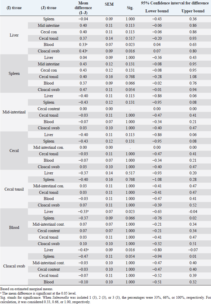 Table 4. Comparison of overall means for isolation of S. enterica (SE PT 1) 10 times from different tissues with each other for chicks from hour 6 till day 21 pi.