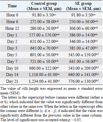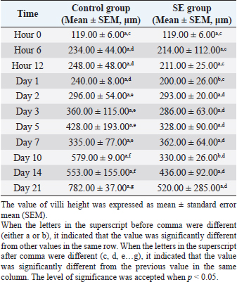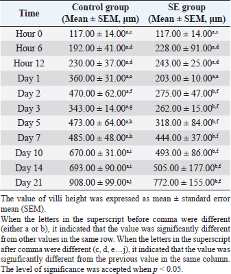 The villi height in the control group was significantly (p < 0.05) greater than the height in the previous time at hour 6, days 1,3, 5, 7, 10, and 21 pi (Table 5). JejunumThe villi height in the jejunum of the SE group was rising every time apart from days 1 and 3 pi. The height was significantly (p < 0.05) greater than the height in the same group (SE) at hour 6 days 1 and 2 pi. The villi height in the control group increased every time apart from day 3 pi. The height was significantly (p < 0.05) greater than the height in the same group (control) at hour 6, days 1, 2, 3, 5, 10, and 21 pi. When the height value in the SE group was compared with the height in the control group, it was significantly (p < 0.05) smaller than the height in the control group on days 1, 2, 3, 5, and 10 pi (Table 6). IleumThe villi height in the ileum of the SE group was fluctuating, in other words, sometimes, it increased and sometimes it decreased in comparison with the measurement of the time before. However, only on day 2 pi, there was a significant (p < 0.05) increase. When the height value in the SE group was compared with the height in the control group, it was significantly (p < 0.05) greater in the control group only on days 1 and 10 pi. The villi height in the control group increased significantly (p < 0.05) more than the height in the previous time in the control group only at hour 6, days 2, 10, and 21 pi (Table 7). Table 5. Villi height in the duodenum of chicks infected with S. enterica (SE PT 1) from hour 0 till day 21 pi.