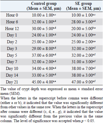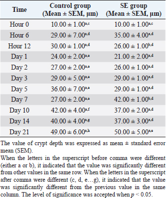 Crypt depthDuodenumThe crypt depth in the duodenum of the SE group was significantly (p < 0.05) greater than the depth in the duodenum of the control group at hour 6 and day 7 pi. The crypt depth in the SE group was significantly greater than the previous value in the same group (SE) at hours 6, 12, days 2, 3, 10, 14, and 21 pi. The crypt depth in the control group was significantly (p < 0.05) greater than the previous value in the control group at hour 6, days 1 and 14 pi (Table 8). Table 9. Crypts depths in jejunum of chicks infected with S. enterica (SE PT 1) from hour 0 till day 21 pi.