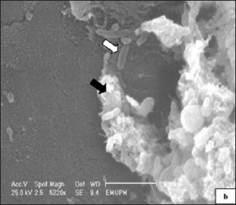 Fig. 5. Cecal tonsil of SPF chicks. (a) Control group on day 5 pi. (b) SE group. Bacterial rod (black arrow) multiplying on microvilli surface of the Cecal tonsil upon M-like M cell (white arrow). Day 5 pi. SEM. Bar=10 μm. The huge difference in the mortality rate between the chicks in this study and the chicks in other cited studies could be attributed to the differences in the virulence of different SE PTs (Dhillon et al., 2001), and different serovars (Cheng et al., 2019). The body weight value, of the chicks in this study, was significantly (p < 0.05) smaller in the SE group than the body weight value in the control group from day 2 pi till the end of the experiment. On day 21 pi, the body weight in the control group reached a peak, which was greater by 39% than the body weight in the SE group. Such reduction in the body weight of the infected chicks might be due to profuse diarrhea. The significantly lower values of body weight in the SE group in comparison with the control group reflected the economic importance of SE infection with respect to commercial loss which could affect the farms’ broilers. In a research conducted by Alisantosa et al. (2000), the body weights in 15 groups of one-day-old SPF chicks were recorded on 14, 21, and 28 days pi of SE PTs 4, 8, and 23. It was found that in the majority of the groups, the average body weights were significantly lower than the uninoculated controls. Also, Dhillon et al. (1999) and Fernández et al. (2001) found a decrease in the body weights with percentages ranging from 10% to 24% in Salmonella inoculated newly hatched chicks compared with uninoculated chicks. Since the surface area of the small intestine is significantly enhanced by the presence of villi and microvilli (Kiela and Ghishan, 2016). So, the intestinal function can be evaluated with the villi height, cell area, and cell mitosis (Yamauchi et al., 1996). However, the villi are covered with columnar epithelial cells or enterocytes at the tip. These are mostly absorptive cells, whereas crypt cells are generally regarded as secretory. Furthermore, most of the nutrient transport occurs in the small intestine (Kiela and Ghishan, 2016). In this study, the villi height in the duodenum of the control group started to increase and became greater significantly (p < 0.05) than the height of the villi in the SE group from day 2 pi till the end of the experiment apart from day 7 pi. The villi height in the jejunum of the control group was greater significantly (p < 0.05) than the height of the villi in the SE group on days 1, 2, 3, 5, and 10 pi. In the ileum, the villi heights were greater significantly (p < 0.05) on days 1 and 10 pi than the height of the villi in the SE group. The depth, of the crypt in the duodenum of the control group, was smaller significantly (p < 0.05) than the depth of the crypts in the duodenum of the SE group at hour 6 and day 7 pi. In the jejunum, the crypt depth, in the control group, was smaller significantly (p < 0.05) than the crypt depth of the SE group at hour 12 and day 7 pi. However, in the ileum, the crypt depth in the control group was also smaller significantly (p < 0.05) than the crypt depth in the ileum of the SE group at hours 6 and 12 pi. The results of villi height and crypt depth in this study indicated that the intestinal absorption in the SE group decreased. In contrast, the secretion of crypts in the SE group increased. However, in one previous study conducted by Rebollada-Merin et al. (2020), in which 7-day-old chicks were challenged with 3.3 × 105 cfu/ml of the monophasic variant of colistin-resistant S. typhimurium, the duodenum villi heights were found slightly lower (539.81 μm) on day 7 of life, higher (896.95 and 1,208.45 μm) on days 14 and 21 of life, respectively. The values obtained in the study of Rebollada-Merin et al. (2020), were also smaller than the values in the control of the present study. In addition, in the study of Rebollada-Merin et al. (2020), the duodenum crypt depths were found greater (78.14, 93.91, and 128.09 μm) on days 7, 14, and 21 of life, respectively. However, greater values in the study of Rebollada-Merin et al. (2020), in comparison with this study, were expected since the chicks in their study were challenged too late in comparison with the chicks in this study. In this study, SE was not isolated from the blood on days 14 and 21 pi. It might be an indication of some clearance of the microbe from the blood. However, Buck et al. (2004) found that fimD mutant of SE PT 4 was present in the blood for 3 weeks after infection of laying hens (ISA Warren Brown) at the age of 19 weeks. Whereas, the wild-type parent strain of the microbe was cleared from the blood within the first 3 days. Using SEM, SE PT 1 was detected in the tissue of the cecal tonsil at hour 6 pi. The bacteria were engulfed by the macrophages at the interepithelial clefts of the M-like M cells of the cecal tonsil which might provide a suggestion about the route of entry of the bacteria from the intestine to the body system. The bacteria also caused some erosion and necrosis of the microvilli which definitely lead to the disturbance and decreased absorption of the feed materials and some reduction in the body weight of the chicks. The significant reduction in the body weight of the SE group in comparison with the control group might also be due to diarrhea and a decrease in villi heights of the duodenum, jejunum, and ileum. The result of SEM supported some previous studies that M cells were the target cells invaded by Salmonella typhi and S. typhimurium (Jepson and Clark, 2001). Another action, induced by Salmonella, was programmed cell death in the macrophage (Bruno et al., 2009). Furthermore, Huang et al. (2020) reported that Salmonella crossed the intestinal epithelium. Then it was engulfed by some phagocytic cells such as dendritic cells and macrophages. It was recommended in future studies to subtype the causative agent, SE PT 1, wit