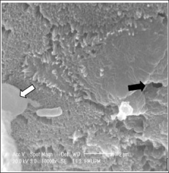 Fig. 3. Cecal tonsil of SPF chicks. SE group. Hour 12 pi. Cecal tonsil. Salmonella enterica (SE PT 1) (white arrow) attacked by macrophage (black arrow). SEM. Bar=5 μm.