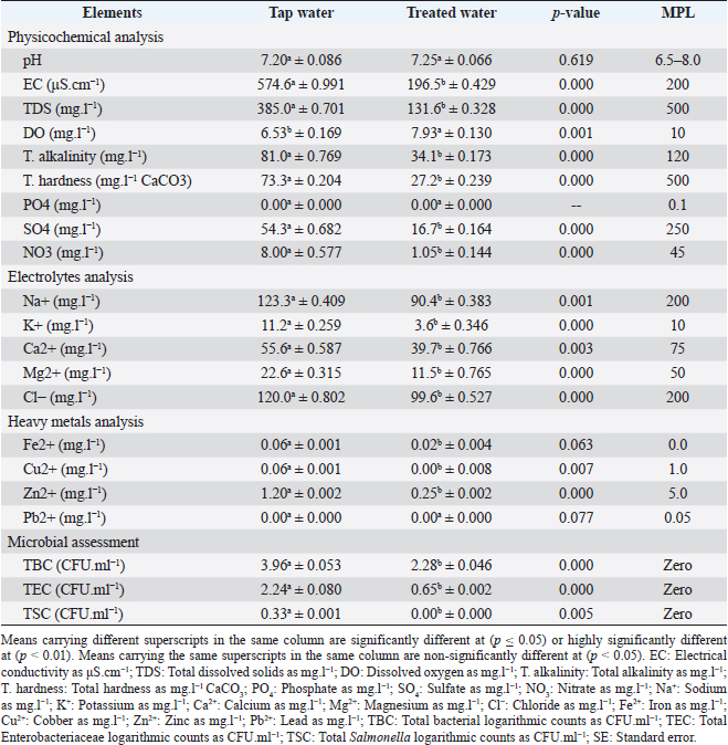 AbstractBackground: The implementation of green technologies is continually gaining attention worldwide and was considered for removing water pollutants and treating municipal water before its disposal. Aim: Evaluation of the laboratory antimicrobial actions and chelating activities, and the field influence of Eichhornia crassipes on performance, biochemical and immunoglobulin concentrations, and intestinal microbiota in overwhelmed broiler chickens. Methods: We assessed the laboratory antimicrobial actions of E. crassipes 1% suspension against bacterial (Escherichia coli O157: H7 and Salmonella Typhimurium) and fungal (Aspergillus niger and Candida albicans) microorganisms using a 96-well minimal inhibitory concentration, and the chelating activities of E. crassipes against calcium sulfate and copper sulfate. Also, we designed randomly four equal groups out of 200 1–day-old Ross® 308 chicks on a deep litter system. Three groups (G1, G2, and G3) were supplied daily with E. crassipes suspension of 1% from the third day until the end of the experiment, while the fourth group (G4) received non-treated tap water. Broilers of G1–3 were challenged with calcium sulfate (75 mg.l-1), copper sulfate (200 mg.l-1), and S. Typhimurium (1.5 × 106 CFU.ml-1) polluted water respectively on the 7th, 14th, 21st, 28th, 35th days of age. We collected 1,914 samples by the end of the study, these samples included 90 E. crassipes pollutants and 480 E. crassipes microbial mixes, 192 sera, 192 intestinal swabs, and 960 tissues. Results: Eichhornia crassipes treated water reveals highly significant (p < 0.01) improvements in water quality assessments and a highly significant (p < 0.01) increase in dissolved oxygen levels compared to tap water. Eichhornia crassipes 1% achieved a 100% adsorption capability for calcium and copper sulfate after 1-hour and 100% bactericidal (E. coli O157: H7 and S. Typhimurium) and fungicidal (A. niger and C. albicans) actions after 1, 2, 2, and 2-hours, respectively. Broilers treated with 1% E. crassipes revealed highly significant (p < 0.01) improvements in performance indices, carcasses characteristics, biochemical and immunological parameters, and highly significant (p < 0.01) decreases of cortisol hormone and bacteriological parameters in all treated broiler groups compared to the control. Conclusion: Eichhornia crassipes 1% reveals a significant improvement in drinking water quality, as well as produces high adsorptive and antimicrobial actions. Eichhornia crassipes 1% improved performance traits, carcass quality, and intestinal microbiota in overwhelmed broilers. Keywords: Antimicrobial, Broiler chickens, Eichhornia crassipes, Immunity, Performance. IntroductionWater pollution is a major worldwide reproducible problem with urbanization and industrial growth. Water quality has been used to point out the physicochemical characteristics to meet suitability for various uses (Li and Qian, 2018a). Water quality is influenced by numerous factors including source geology, meteorological conditions, topography, seasonal variations, and biological considerations (Li et al., 2017a). Clean and palatable water with freedom from disease-producing agents has been the main demand for livestock production (Tian and Wu, 2019). Water is negatively affected by populations' activities and becomes polluted with chemicals and infectious/zoonotic pathogens including bacteria (Soliman et al., 2009a) such as Escherichia coli, Salmonella, Leptospira, and Listeria, protozoa (Soliman et al., 2009b) such as Giardia and Eimeria, and parasitic agents such as Echinococcus, Schistosoma, and Faschiola. Biosecurity pillars have included water quality to provide birds with excellent/satisfactory water (Su et al., 2019). Water purification has been performed using various methods such as photocatalysis (Raval et al., 2016), biochar (Palansooriya et al., 2020), sludge materials (Anastopoulos et al., 2017), ion exchange (Szczepanik, 2017), and eco-friendly byproducts as clay (Soliman et al., 2021d) and Oreochromis niloticus bone (Soliman et al., 2022). Developing eco-friendly, economical, and less destructive alternatives (Phytoremediation) for the handling of water pollutants is a worldwide interest (Shah, 2010). These eco-friendly means must possess higher absorption capabilities in short contact time and accumulation actions for longer periods (Mudgal et al., 2010). Aquatic plants such as Eichhornia crassipes are characterized by high invasiveness, wide spreading (tropical and sub-tropical countries), floating freely, and can grow up to 1 m above the water's surface (Pellegrini et al., 2018). It is known as a fast-growing runner plant and its seeds can remain viable for 28 years (Sarika et al., 2014). Eichhornia crassipes usually survive in an ambient temperature of 25°C–30°C (12°C: 35°C), pH of 5.0: 7.5, and salinity of low than 15%, which above contributes to chlorosis and death (Kong et al., 2014). It has been recognized as an ecological plague in Egypt from 1879 to 1892 and contributed to biomass suffocation, diminishing fish reservoirs, and negatively influencing the economy (Twongo, 2019). Eichhornia crassipes has high absorbing power and thus has been used in wastewater purification. Eichhornia crassipes have been used in numerous fields such as braiding material and fiber source in India, Thailand, and Vietnam, biogas production, sludge field, adsorbent (Abdel Shafy et al., 2016), bio-cleaning (Ansari et al., 2014), food source, small scale paper production, carotene-based table vegetable, dermatological medicinal applications in horses, sustainable source of oxygen, and bio-herbicidal agent through the production of hydrogen peroxide and inhibition of the soluble peroxidase activities (Chai et al., 2013). Here, in this study, we evaluated the laboratory antimicrobial actions of the E. crassipes 1% suspension against bacterial (E. coli O1527: H7 1.7 × 1011 CFU.ml-1 and Salmonella Typhimurium 1.