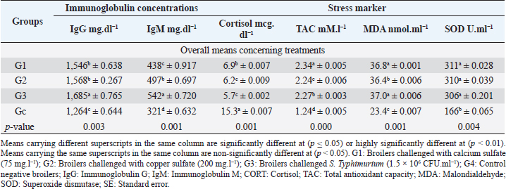 Biochemical, immunological, and hormonal profilesEichhornia crassipes 1% treated water reveals highly significant (p < 0.01, Table 4) improvements of the measured biochemical such as TP (df=3, F=60.6, and p=0.000), ALT (df=3, F=4,329.5, and p =0.000), urea (df=3, F=142.4, and p =0.000), CREAT (df=3, F=762.1, and p=0.000), GLUCO (df=3, F=1,197.9, and p=0.000), TG (df=3, F=17,063.2, and p=0.000), and TC (df=3, F=557.1, and p=0.000), and antioxidant parameters such as TAC (df=3, F=4,491.8, and p=0.000), MDA (df=3, F=1,625.8, and p=0.000), and SOD (df=3, F=640.0, and p =0.000) in all treated broiler groups compared to the control. We reported that E. crassipes 1% treated water reveals in Table 5 highly significant (p < 0.01, Table 5) increases in immunoglobulins G (df=3, F=112.5, and p=0.000) and M (df=3, F=36.3, and p=0.000) of G3 compared to the other treated groups and the control. Meanwhile, the cortisol hormone (Table 5) reveals highly significant (p < 0.01) decreases (df=3, F=358.0, and p=0.000) in all treated broiler groups compared to the control. Bacteriological assessmentsEichhornia crassipes 1% treated water in Figure 2 reveals highly significant (p < 0.01) decreases in the TBC of intestinal swabs (df=3, F=29.9, and p =0.000) and breast muscles (df=3, F=13.2, and p =0.000), TEC of intestinal swabs (df=3, F=24.0, and p=0.000) and breast muscles (df=3, F=7.6, and p=0.000), and TSC (duodenal swabs) (df=3, F=5.0, and p=0.002) in all treated broiler groups compared to the control. DiscussionWater quality in broiler farms contributes to the general conditions of production, performance, and reproduction (Maharjan et al., 2016). Broilers hold an important position among food animals, thus requiring a healthy environment and water of high quality to contribute to good health and production (Magor et al., 2013). Drinking water in broiler farms can be easily polluted/contaminated with a variety of micro-organisms through the birds themselves or the surrounding sources contributing to a potential risk to the broilers and humans (Van der et al., 2016). According to Maes et al. (2019), the arriving pollutants concerning some micro-organisms such as Stenotrophomonas maltophilia, Pseudomonas geniculata, and Pseudomonas aeruginosa contribute to a lowering in the water quality and characterization. Table 3. Live, carcass, and organ weights (Mean ± SE) in different groups supplied with E. crassipes (1 g.l-1) treated water.