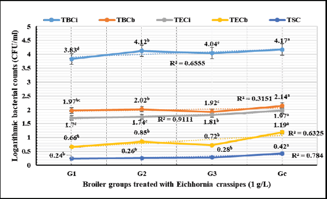 Fig. 2. Logarithmic bacterial counts (Mean) in different groups supplied with E. crassipes (1 g.l-1) treated water. G1=Broilers challenged with calcium sulfate (75 mg.l-1), G2=Broilers challenged with copper sulfate (200 mg.l-1), G3=Broilers challenged Salmonella Typhimurium (1.5 × 106 CFU.ml-1), G4=control broilers. TBCi=Total bacterial counts in intestinal swabs, TBCm=Total bacterial counts in breast muscles, TECi=Total Enterobacteriaceae counts in intestinal swabs, TECm=Total Enterobacteriaceae counts in breast muscles, TSC=Total Salmonella count in intestinal swabs. Eichhornia crassipes reveals some capabilities in different studies such as enhancing the water quality characteristics, minimizing the pollutants' (heavy metals, and dyes) concentrations (Priya and Selvan, 2017), minimizing the biological oxygen demands (Wei et al., 2019), extract palm oil from mill waste in Malaysia, bio-indication for heavy metal pollution of rivers in Pakistan (Srivastava et al., 2019), Phyto-purification of wastewater (Victor et al., 2016), reduction of chromium levels (99.5%) in wastewater 15 days post-treatment (Saha et al., 2017), and extreme reduction of nitrates in wastewater combined with eutrophication (Wenwei et al., 2016). Eichhornia crassipes treated water in the current study reveals highly significant declines in physicochemical, electrolytes, heavy metals, and microbial assessments and a highly significant increase in dissolved oxygen levels compared to tap water. The results agreed with those of Wuijts et al. (2018) who recorded that E. crassipes can actively minimize heavy metals and coloring agent concentrations from the water through bio-sorption, precipitation, and accumulation. Hartmann et al. (2018) also reported the high capabilities of E. crassipes to absorb dyes and heavy metals using electrostatic forces and improve water quality characteristics. Mahmood et al. (2010) recorded that E. crassipes water treatment contributed to a significant reduction of the biological and chemical oxygen demand (70.0%), the total solids (50.6%), and pH to a level that counteracts microbial survival. Also in agreement with our results, Dar et al. (2011) evaluated the capability of E. crassipes to treat different dilutions of wastewater (25%, 50%, 75%, and 100%) and recorded significant improvements in the physicochemical and biological parameters with significant increases of the dissolved oxygen levels. They recommended E. crassipes as an adsorbent to treat wastewater from agricultural, industrial, and municipal sources. Eichhornia crassipes 1% suspension in the current results achieved 100% reductions of cobber and total and calcium hardness after 1-hour and 100% antimicrobial efficacies against E. coli O157: H7, S. Typhimurium, A. niger, and C. albicans after 1, 2, 2, and 2-hours, respectively. The results were synchronized with those of Vishwakarma et al. (2018) who reported that E. crassipes contributed to a shift in the pH up to 8.6 which is unfavorable to microbial growth and survival, and a significant reduction in the levels of total dissolved solids, conductivity, total hardness, biological and chemical oxygen demands, nitrate-nitrogen, and ammonium nitrogen in the treated water. Our results were also synchronized with those of Long et al. (2018) who revealed the strong abilities of E. crassipes for minimizing copper, cadmium, lead, zinc, chromium, and iron up to 97.3%, 94.8%, 94.7%, 96.8%, 94.3%, and 93.5%, respectively. Deng et al. (2018) recorded in agreement with the current results the strong antimicrobial activity of E. crassipes against Mycobacterium phlei, Candida parapsilosis, and Rhizopus oryzae. The field clinical trial reveals highly significant improvements in PIs, live weights, carcasses quality, biochemical parameters, immunoglobulin concentrations, cortisol hormone, and bacteriological assessments in broilers supplemented with E. crassipes treated water compared to the control group. The results agreed with those of Che et al. (2020) who recorded similar capabilities of Eichhornia purpurea (100, 200, and 600 mg.l-1) treated water which enhanced weight acquires and carcasses yield and they recommended E. purpurea (200 mg.l-1) as a natural effective eco-friendly water treatment. Abdel Shafy et al. (2016) reported that E. crassipes collected from the Nile River in Egypt contain some nutritive ingredients such as protein (10.7%), fat (4.94%), crude fiber (17.9%), nitrogen (44.3%), calcium (1.42%), and phosphorus (0.58%) making it suitable as a feed supplement with enhanced weight gains and improved feed conversions, and potential adsorbent of heavy metals polluting the drinking water. Jianbo et al. (2008) found an increased performance, FI, and egg production in ducks supplied with E. crassipes treated wastewater, and they attributed these improvements to the higher crude protein contents of the supplied E. crassipes. Rufchaei et al. (2021) documented an improvement in the marketing weights, weight gains, and growth rates in fish fed with 1.5% of E. crassipes than those fed 0%, 0.5%, and 1% of E. crassipes leaves powder. Dumaup et al. (2020) from another perspective revealed no significant effect on the broiler's performance except for FI when supplied with E. crassipes. Abdulganiyu et al. (2013) also recorded no significant differences in initial and final body weights, FIs, and FCR among day-old Isa Brown pullets that received E. crassipes (0%, 5%, 10%, and 15%) for 8 weeks. The high recorded improvements in broilers supplemented with E. crassipes treated water in our study might be attributed to the highly digestible protein contents. Wimalarathane and Perera (2019) recommended the use of E. crassipes as a dietary supplement in animals and poultry for its nutritive value and low cost. Indulekha et al. (2019) also recommended the use of E. crassipes as a dietary supplement to increase the production in animals and poultry. The recorded prominent immune-stimulant, antioxid