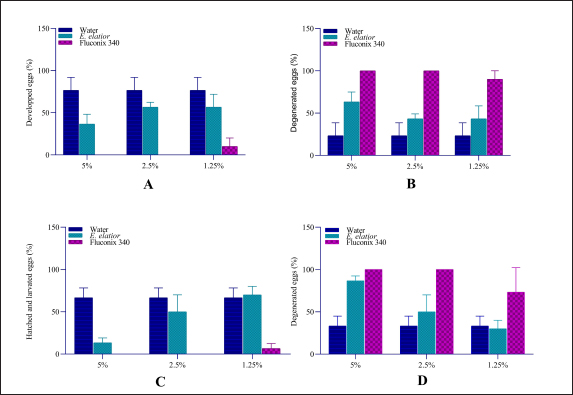 Fig. 2. Ovicidal efficacy of E. elatior in different concentration and incubation compared to negative control, aquadest and synthetic anthelmintic, Fluconix 340. (A) Hatched and developed egg after incubation on day 11; (B) Degenerated eggs after incubation on day 11; (C) Hatched and developed eggs after incubation on day 14; and (D) Degenerated eggs after incubation on day 14.