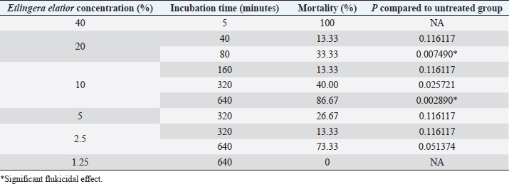 AbstractBackground: Fasciolosis is a parasitic disease affecting the hepatobiliary system of livestock worldwide. The control of the fluke is important to be performed in endemic regions. Aim: This study aims to evaluate the effect of Etlingera elatior ethanolic extract on egg and adult stadia of Fasciola gigantica. Methods: Fasciola gigantica in different stages were incubated with E. elatior ethanolic extract in different concentrations and time points. Results: The number of developed eggs with different concentrations of 1.25%, 2.5%, and 5% was significantly decreased by 36.67%, 56.67%, and 56.67% on day 11 post-incubation, which showed an ovicidal effect of the herb. The developed eggs on day 14, which were represented by hatched larvae, were also decreased by 70%, 50%, and 13.33%, respectively. Significant flukicidal effects were observed in the incubation time of 80 minutes for the concentration of 20% (p =0.007) and 640 minutes for 10% concentration (p =0.003). Surface microscopy of adult F. gigantica showed damaged skin and spina with the erosion of the inner membrane and detached syncytium from the tegument. Conclusion: Overall, the results indicate that E. elatior has a promising anthelmintic property against F. gigantica in both ova and adult stages. Keywords: Fasciola gigantica, Etlangiera elatior, Ovicidal, Flukicidal, Bioresources. IntroductionFasciolosis is a parasitic disease that infects the hepatobiliary system of livestock, with Fasciola gigantica being the causative agent in tropical countries (Good and Scherbak, 2022), and Fasciola hepatica in temperate regions (Arjona et al., 1995). The infection is transmitted through food or drinking water contaminated by metacercaria of Fasciola sp. (Najib et al., 2020). Furthermore, infection causes serious liver damage, with constraints to nutrient metabolism in livestock husbandry (Luo et al., 2021). The infected liver is characterized by the presence of various lesions, including fibrosis in the parenchyma area (Mendes et al., 2012). Fasciolosis also adversely affects the livestock carcass production (Rashid et al., 2019) and causes economic losses of up to US$3.2 billion/year worldwide (Mehmood et al., 2017). The high prevalence in tropical countries is supported by warm climatic conditions and the ability of the intermediate hosts to live throughout the year. In Indonesia, F. gigantica is commonly found in bovines, small ruminants, and buffaloes (Pleasance et al., 2011). Fasciola sp. is also well-known as a zoonotic parasite and human fascioliasis is currently identified transmitted through raw foods. Metacercaria cysts on the leaves are accidentally eaten together with vegetables or salad (Mas-Coma et al., 2014). The global prevalence of Fasciola sp. infection is estimated at 17 million people from 61 countries. Another 180 million people are at risk of infection because they are in endemic areas (McManus, 2020). Moreover, human fasciolosis has been identified on various continents and countries. In America, infections were reported in Peru (Esteban et al., 2002), Bolivia (Valero et al., 2009), Argentina (Mera y Sierra et al., 2011), Mexico (Zumaquero-Ríos et al., 2013), and Brazil (Pritsch and Molento, 2018). While in Asia, several cases have been found in China (Chen et al., 2013), the Philippines (Kumari et al., 2013), Vietnam (Carrique-Mas and Bryant, 2013), and Singapore (Ahamed et al., 2013) Various countries in the African continent have reported cases of human fasciolosis such as Senegal (Ka et al., 2002), Zimbabwe (Esteban et al., 2003), Cameroon (Mbuh and Mbwaye, 2005), and South Africa (Black et al., 2013). Europe also has a history of this disease such as in France (Rondelaud et al., 2000), Turkey (Yılmaz and Gödekmerdan, 2004), Greece (Assimakopoulos et al., 2010), England (Fox et al., 2011), Spain (Mas-Coma et al., 2014), and Italy (Mas-Coma et al., 2018). The most commonly used method of controlling F. gigantica is the treatment using commercial drugs from the classes of triclabendazole, albendazole, and benzimidazole (Merachew and Alemneh, 2020). The disadvantage of using certain types of anthelmintic for a long time is the emergence of resistance. Anthelmintic resistance can also occur because of a poor understanding of farmers in inappropriate dosing and lack of drug efficacy testing (Fairweather, 2011; Kelley et al., 2016). Although there are several reports of anthelmintic resistance in the world, it was first discovered in Australia in 1995 (Overend and Bowen, 1995), 2014 (Brockwell et al., 2014), and 2015. In Europe, there have been cases of anthelmintic resistance in Spain (Alvarez-Sanchez et al., 2006), Scotland (Sargison and Scott, 2011), and the Republic of Ireland (Kelley et al., 2016). Resistance also occurs in America, Argentina (Olaechea et al., 2011), Peru (Ortiz et al., 2013), and Chile (Gil et al., 2014). Using natural ingredients can be an alternative to anthelmintic because they are environmentally friendly and based on biological resources available. Indonesia is a country rich in biodiversity, including medicinal plants that have been used for decades (Sofowora et al., 2013). The Kecombrang plant (Etlingera elatior) is native to Indonesia and belongs to the Zingiberaceae group that has been used in the manufacture of traditional medicine and vegetables (Naufalin, 2019). Phytochemical screening of the Kecombrang-flower methanol extract showed the presence of flavonoids, terpenoids, saponins, and tannins (Lachumy et al., 2010), which have anthelmintic activities to different fluke (Wang et al., 2010). In this study, we aim to determine the effect of E. elatior extract on the ova and adult stages of F. gigantica in vitro. Materials and MethodsEggs and adult F. gigantica collectionFasciola gigantica was collected from naturally infected bovines in Ampel Abbatoir, Boyolali, Central Java. The eggs were isolated from the gallbladder, while the living flukes were manually collected from the
