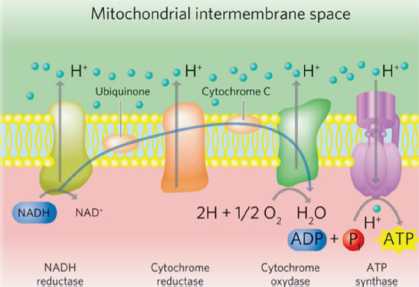 Fig. 2. The mitochondrial electron transport chain. Source: Stephens (2019). Reprinted with permission. Mechanisms of actionMitochondrial effects of tPBMTNeuronal cellular energy failure due to mitochondrial dysfunction has been recognized as an early event in age-related cognitive decline. Both decreased cerebral blood flow and toxic effects of Aβ contribute to mitochondrial dysfunction (Landsberg et al., 2012; De la Torre, 2017, 2020; Da Luz Eltchechem et al., 2017; Chapagain et al., 2018; Dewey et al., 2019). Neuronal mitochondria are the primary source of the brain’s energy requirements via production of ATP. In addition to their role in neuronal energy production, functional mitochondria can mitigate the toxic effects of Aβ on neuronal cellular function. As mitochondrial function declines, the adverse effects of Aβ on cellular function (including that of the mitochondria) worsens (Gonzalez-Lima et al., 2014; Da Luz Eltchechem et al., 2017; De la Torre, 2017, 2020; Lu et al., 2017). Mitochondrial CCO has two subunits that contain copper (CuA and CuB) and these metal ions are responsible for reducing molecular oxygen to water, generating ATP in the process. These metallic components represent the chromophores of CCO and—when stimulated by appropriate wavelengths of light—cause accelerated electron transfer reactions of the cellular respiratory apparatus. The two absorption peaks for the stimulation of mitochondrial CCO are approximately 660 and 810 nm (Lapchak, 2012; Hamblin, 2016, 2019; Anders et al., 2017; Salehpour et al., 2017; Enengl et al., 2020). In addition to evidence that tPBMT at appropriate wavelengths stimulates neuronal mitochondrial ATP production via direct activation of CCO, there is also evidence that levels of CCO are amplified (Gonzalez-Lima et al., 2014; De la Torre, 2017, 2020; Salehpour et al., 2017; Hamblin, 2019). Additionally, tPBMT triggers a process called retrograde mitochondrial signaling, in which the stimulated mitochondria signal the cell nucleus to alter gene expression in order to augment mitochondrial function, as well as generate new mitochondria (biogenesis) (Hennessy and Hamblin, 2017; Hamblin, 2019). Another beneficial effect on mitochondrial function related to tPBMT has been demonstrated that is not CCO-dependent. Microscopic water layers adjacent to the inner mitochondrial membrane, referred to as interfacial water layers (IWL), become more viscous under conditions of oxidative stress (as occurs with AD/CCD). This viscosity impedes the function of ATP synthase, the final step in the oxidative respiratory chain. Application of PBMT at a wavelength of 670 nm has been shown to decrease IWL viscosity with subsequent improvement in mitochondrial ATP synthase function and cellular ATP production (Hamblin, 2019; Sommer, 2019). Effects of tPBMT on beta-amyloid (Aβ) loadAccumulation of the neurotoxic protein Aβ in brains of AD/CCD patients is well established. Formerly thought of as a primary aspect of the disease process, more recent evidence suggests that Aβ deposition is a consequence of other factors, such as vascular compromise and inflammation (Dewey et al., 2019; Hamblin, 2019). Furthermore, there is growing evidence that pathological alteration in the gastrointestinal microbial distribution (dysbiosis) is a major inciting factor for brain vascular damage and inflammation in AD/CCD; since Aβ is a known antimicrobial protein, its accumulation in AD/CCD may be a response to microbes and/or their toxins (Ambrosini et al., 2019; Dewey and Rishniw, 2021). Amyloid precursor protein (APP) is the source of Aβ, which is preferentially produced when β-secretase and γ-secretase activities predominate over α-secretase activity (as occurs with AD/CCD) (De Taboada et al., 2011; Hamblin, 2019). Aβ is known to trigger the production of reactive oxygen and nitrogen species, as well as several proinflammatory cytokines (e.g., IL-1β, IL-6, and TNF-α), all of which can lead to cellular damage. Aβ accumulation also leads to neuronal mitochondrial damage. Another detrimental action of Aβ is stimulating premature neuronal cell death (apoptosis) via various signaling pathways (De Taboada et al., 2011; Da Luz Eltchechem et al., 2017; Hamblin, 2019). Aβ can also cause neuronal damage via increasing formaldehyde (FA) levels in the brain. FA accumulates in AD brains due to decreased activity of formaldehyde dehydrogenase (FDH), the enzyme responsible for clearing FA. Aβ is thought to inactivate FDH and, in turn, elevated FA stimulates increased accumulation of Aβ (Huang et al., 2020). In vitro and in vivo studies have demonstrated the ability of PBMT to cause disaggregation of Aβ (Yagi et al., 2010; De Taboada et al., 2011; Da Luz Eltchechem et al., 2017; Yue et al., 2019; Zhang et al., 2019; Tao et al., 2021). There are several mechanisms via which tPBMT is believed to decrease brain Aβ load in AD/CCD. Such mechanisms include suppression of β-secretase activity and stimulation of enzymes responsible for degrading Aβ peptides (De Taboada et al., 2011; Zhang et al., 2019). Microglia have been shown to play a pivotal role in the generation and dissolution of Aβ in rodent AD models. There are two main types of activated microglia, designated as M1 and M2. M1 microglia are elevated in AD and are responsible for producing pro-inflammatory cytokines, disruption of the blood–brain barrier, neuronal damage, and ultimately cognitive decline. M2 microglia are considered neuroprotective, releasing anti-inflammatory cytokines, and enhancing neurotrophic factor release (Tang and Le, 2016). PBMT has been shown to shift the balance of microglia to the M2 phenotype in rodent models (Hamblin, 2019; Tao et al., 2021). In one study involving a mouse AD model, tPBMT application with 1,070 nm light led to decreased brain levels of Aβ and improvement of cognitive test scores. This study also showed a decrease in the M1 microglia population (particularly perivas