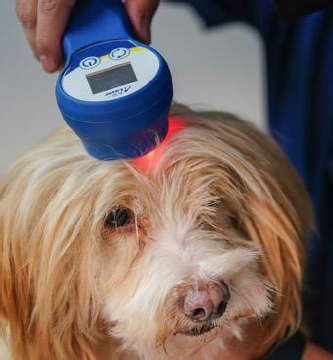 Fig. 4. Application of tPBMT to a dog using a class 1 laser (photo courtesy of Iker Asteinza DVM). ConclusionTranscranial photobiomodulation therapy is a promising new treatment modality for patients with cognitive decline. It has shown efficacy in rodent AD models and human clinical trials and may be adaptable to CCD. Beneficial mechanisms of action for tPBMT for AD/CCD include increased energy (ATP) production via mitochondrial stimulation, reducing brain beta-amyloid (Aβ) load and adverse effects of this toxic protein, stimulating brain levels of BDNF, mitigating neuroinflammation and oxidative brain damage, and improving brain blood flow. Optimum dosing parameters and treatment frequency for tPBMT in CCD patients are unknown but data from rodent AD studies and human clinical trials can be used to approximate a logical protocol. Evaluating tPBMT in dogs afflicted with CCD will likely require at home therapy with an easily portable tPBMT delivery system that can deliver the necessary dose of light energy in a short time period. Future clinical studies evaluating tPBMT as a treatment modality for CCD will be necessary to devise short- and long-term protocols, as well as to evaluate the safety and efficacy of such protocols. Conflict of interestThe authors declare that there is no conflict of interest. ReferencesAmbrosini, Y.M., Borcherding, D., Kanthasamy, A., Kim, H.J., Willette, A.A., Jergens, A., Allenspach, K. and Mochel, J.P. 2019. The gut-brain axis in neurodegenerative diseases and relevance of the canine model: a review. Front. Aging Neurosci. 11, 1–14. doi: 10.3389/fnagi.2019.00130. Anders, J.J., Ketz, A.K. and Wu, X. 2017. Basic principles of photobiomodulation and its effects at the cellular, tissue, and system levels. In Laser therapy in veterinary medicine: photobiomodulation. Eds., Riegel, R.J. and Godbold, J.C. Ames, IA: Wiley, pp: 36–51. Arancibia, S., Silhol, M., Mouliere, M.J., Hollinger, I., Maurice, T. and Tapia-Arancibia, L. 2008. Protective effect of BDNF against beta-amyloid induced neurotoxicity in vitro and in vivo in rats. Neurobiol Dis. 31, 316–326. Barrett, D.W. and Gonzalez-Lima, F. 2013. Transcranial infrared laser stimulation produces beneficial cognitive and emotional effects in humans. Neurosci. 230, 13–23. Bartels, K.E. 2017. Therapy laser safety. In Laser therapy in veterinary medicine: photobiomodulation. Eds., Riegel, R.J. and Godbold, J.C. Ames, IA: Wiley, pp: 29–35. Chan, A.S., Lee, T.K., Yeung, M.K. and Hamblin, M.R. 2019. Photobiomodulation improves the frontal cognitive function of older adults. Int. J. Geriatr. Psychiatry. 34, 369–377. Chapagain, D., Range, F., Huber, L. and Viranyi, Z. 2018. Cognitive aging in dogs. Gerontology 64(2), 165–171. doi: 10.1159/000481621. Chen, C., Hung, H. and Hsu, S. 2008. Low energy laser irradiation increases endothelial cell proliferation, migration and eNOS gene expression possibly via P13K signal pathway. Lasers Surg. Med. 40, 46–54. Cury, V., Moretti, A.I.S., Assis, L., Bossini, P., de Souza Crusca, J., Neto, C.B., Fangel, R., de Souza, H.P., Hamblin, M.R. and Parizotto, N.A. 2013. Low level laser therapy increases angiogenesis in a model of ischemic skin flap in rats mediated by VEGF, HIF-1α and MMP-2. J. Photochem. Photobiol. 125, 164–170. Da Luz Eltchechem, C., Salgado, A.S.I., Zangaro, R.A., da Silva Pereira, M.C., Kerppers, I.I., da Silva, L.A. and Parreira, R. B. 2017. Transcranial LED therapy on amyloid-β toxin 25-35 in the hippocampal region of rats. Lasers Med. Sci. 32, 749–756. De la Torre, J.C. 2016. Cerebral perfusion enhancing interventions: a new strategy for the prevention of Alzheimer dementia. Brain Pathol. 26, 618–631. De la Torre, J.C. 2017. Treating cognitive impairment with transcranial low level laser therapy. J. Photochem. Photobiol. 168, 149–155. De la Torre, J.C., del Olmo, A. and Valles, S. 2020. Can mild cognitive impairment be stabilized by showering brain mitochondria with laser photons? Neuropharmacology 171, 107841. doi: 10.1016/j.neuropharm.2019.107841. De Taboada, L., Yu, J., El-Amouri, S., Gattoni-Celli, S., Richieri, S., McCarthy, T., Streeter, J. and Kindy, M.S. 2011. Transcranial laser therapy attenuates amyloid-β peptide neuropathology in amyloid-β protein precursor transgenic mice. J. Alzheimers Dis. 23, 521–535. Dewey, C.W., Davies, E.S., Xie, H. and Wakshlag, J.J. 2019. Canine cognitive dysfunction: pathophysiology, diagnosis, and treatment. Vet. Clin. Small Anim. Pract. 49, 477–499. Dewey, C.W., Rishniw, M., Johnson, P.J., Platt, S., Robinson, K., Sackman, J. and O’Donnell, M.O. 2020. Canine cognitive dysfunction patients have reduced total hippocampal volume compared with aging control dogs: a comparative magnetic resonance imaging study. Open Vet. J. 10, 438–442. Dewey, C.W. and Rishniw, M. 2021. Periodontal disease is associated with cognitive dysfunction in aging dogs: a blinded prospective comparison of visual periodontal and cognitive questionnaire scores. Open Vet. J. 11, 210–216. Enengl, J., Hamblin, M.R. and Dungel, P. 2020. Photobiomodulation for Alzheimer’s disease: translating basic research to clinical application. J. Alzheimers Dis. 75, 1073–1082. Gonzalez-Lima, F., Barksdale, B.R. and Rojas, J.C. 2014. Mitochondrial respiration as a target for neuroprotection and cognitive enhancement. Biochem. Pharm. 88, 584–593. Gonzalez-Lima, F. and Barrett, D.W. 2014. Augmentation of cognitive brain functions with transcranial lasers. Front. Syst. Neurosci. 8, 36. DOI: 10.3389/fnsys.2014.00036. Halliday, G. 2017. Pathology and hippocampal atrophy in Alzheimer’s disease. Lancet Neurol. 16, 862–864. Hennessy, M. and Hamblin, M.R. 2017. Photobiomodulation and the brain: a new paradigm. J. Opt. 19(1), 013003. DOI: 10.1088/2040-8986/19/1/013003. Hamblin, M.R. 2016. Shining light on the head: photobiomodulation for brain disorders. BBA Clin. 6, 113–124. Hamblin, M.R. 2019. Photobiomodulation for Alzheimer’s disease: h