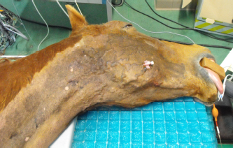 Fig. 2. A 20-G intravenous catheter placed into the right congestive facial vein in the anesthetized horse. The left jugular vein appeared as an anechoic tubular structure which collapsed under the probe pressure, the color Doppler examination revealed normal blood flow within the vessel (Fig. 3). Bi-dimensional ultrasonography of the right jugular vein showed a heterogeneous, non-cavitating, hypoechoic structure occluding a narrowed right jugular vein for about 30 cm of length localized in the proximal and mid-portion of the neck compatible with a thrombus (Fig. 4). The color Doppler examination showed blood flow through the lateral portions of the thrombus in the cranial and mid-portions of the right jugular vein (Fig. 5). Cranially to the thrombus, a marked distension of the maxillary and linguofacial veins was evident, with a turbulent and echogenic flow; the latter was compatible with blood stasis near the thrombus (Fig. 6). Caudally to the thrombus, the right jugular vein presented reduced diameter, thickened walls, and normal blood flow (Fig. 7). The cranial part of the thrombus originated from a heterogeneous scare tissue, localized at the level of the right mandibular angle (Fig. 8). After injection of the first saline contrast bolus in a right facial vein, no microbubbles appeared in the right jugular vein, caudally to the thrombus, proving the presence of a complete right jugular vein occlusion. On the contrary, after injection of the second bolus, microbubbles were visualized in the left jugular vein as small, intense, echo signals within the vein lumen, demonstrating the presence of collateral circulation that drained the blood from the right facial veins to the left jugular vein (Fig. 9). Venography results confirmed the complete occlusion of the right jugular vein and the presence of submandibular venous collaterals that connected the right facial veins with the left jugular vein (Figs. 10 and 11). Based on the previous results, the diagnosis of JVT with complete occlusion of the vessel lumen was confirmed. The horse’s owner refused any proposed medical or surgical therapy.