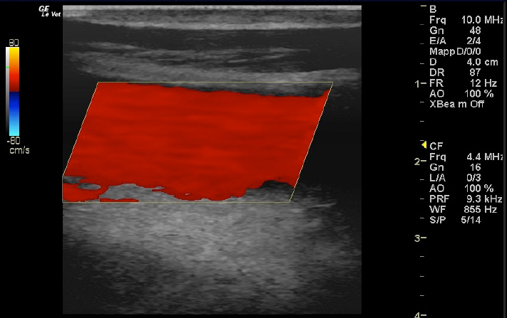 Fig. 3. Color Doppler image of the normal blood flow in the left jugular vein. Ethical approvalThe publication of this case report was approved by the Institutional Animal Care and Use Committee at the University of Sassari (Comitato Indipendente di Bioetica di Ateneo per la Sperimentazione Animale (CIBASA); protocol number 22865), according to the Italian legislation.