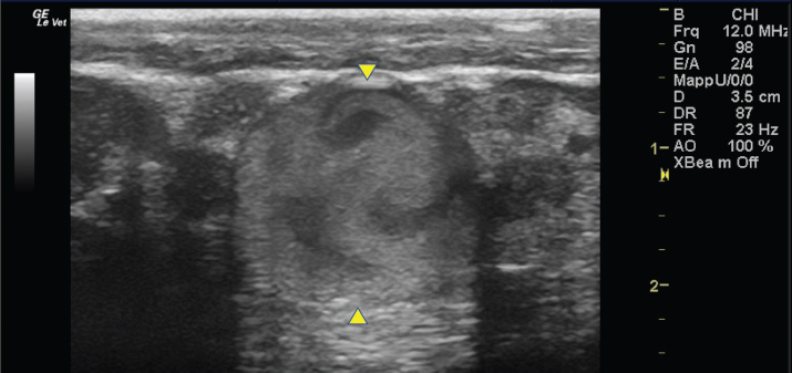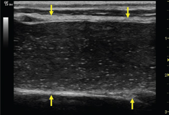 Fig. 7. Bi-dimensional ultrasonographic image of the right jugular vein, caudally to the thrombus, in longitudinal section (arrows). No microbubbles appeared caudally to the thrombus, following injection of the first saline contrast bolus. DiscussionThe description of the present clinical case shows that SCU is a valid tool to assess vessel patency and presence of collateral circulation in JVT. Two-dimensional ultrasonography is useful in diagnosing JVTP and JVT and in monitoring the progression of the disease (Gardner et al., 1991; Borghesan et al., 2018). Vessel patency is usually assessed by venography and Doppler ultrasonography (Hussni et al., 2009; Borghesan et al., 2018). However, venography requires repeated x-ray exposure and Doppler ultrasonography is highly operator and equipment-dependent. Furthermore, the Doppler color examination allows evaluating blood flow presence and direction only in small portions of the vessel at a time; therefore, when the thrombus is 15–44 cm long, as happens in the JVT of horses (Borghesan et al., 2018), it does not give a global view of the obstructed vessel. On the contrary, the SCU test allows a real distinction between total and partial vessel occlusion, it can be easily performed and objectively interpreted using standard ultrasound equipment, it is not expensive and, finally, it does not require x-ray exposure.