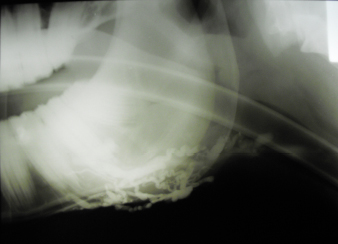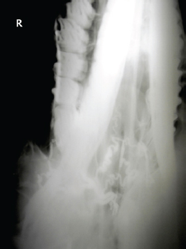 Fig. 11. Venographic examination, ventro-dorsal view. Note the large number of collateral vessels draining the contrast. Saline agitated microbubbles are small air-filled microspheres that have specific acoustic properties that make them useful as a contrast agent in ultrasound imaging. The microbubbles can be easily identified by a two-dimensional ultrasonography as they appear as small hyperechoic particles passing in the lumen of the vessel. Agitated saline solution is demonstrated to be safe in both large and small animals (Bonagura and Pipers, 1983). Air microbubbles disappear in a few seconds after intravenous injection; firstly, because the solubility of air in blood is high and, secondly, because the lungs filter the large microbubbles present in the agitated saline solution (Dijkmans et al., 2004). Jugular vein occlusion, secondary to thrombophlebitis and thrombosis, is one of the most common vascular diseases in horses. The condition is usually secondary to prolonged or improper placement of intravenous catheters or injections of irritating drugs that lead to mechanical or chemical injury of the vessel walls (Dickson et al., 1990; Spurlock et al., 1990; Meister et al., 1993; Schoster, 2017). In the clinical case described in this report, a repeated trauma due to a rope tied too tight around the neck may have caused abrasions at first, with a consequent deep subcutaneous fibrosis around the venous jugular wall, and consequently thrombosis. Other authors have previously reported a case of JVTP secondary to the extension of a buccal lesion in a thoroughbred horse (Matsuda et al., 2010). Although a previous study has shown that racing performances were only slightly negatively affected by JVTP in horses (Moreau and Lavoie, 2009), jugular vein occlusion may potentially decrease the athletic performances because of impaired venous drainage of the head that can lead to brain congestion and edema as well as nasal, pharyngeal, or laryngeal mucosal congestion that could potentially cause airway obstruction during intense exercise (Moreau and Lavoie, 2009). Because of that, several medical and/or surgical therapies have been proposed to recanalize the occluded vessel and reduce proximal venous congestion. In this context, SCU could therefore be used as a tool to monitor the effectiveness of therapy and the progression of the disease. The test can be performed in sedated animals, although, in our case, we put the horse under general anesthesia because he was going to be operated. One of the main limitations of the SCU test, in jugular vein occlusion, is that it is not able to distinguish between recanalization and homolateral compensatory circulation which drains the blood from the distal to the proximal area of the thrombus. This compensatory vascular pattern has been described in experimentally induced JVTP (Borghesan et al., 2018). In the clinical case described here, we did not observe the presence of collateral vessels that joined the cranial with the caudal extremities of the thrombus. We hypothesize that this type of collateral circulation develops only in experimentally induced JVTP due to the rapidity of the occlusion process. In conclusion, the SCU test appears as a valid method to assess the vessel patency in JVT in horses. The test could be used as a method to monitor the progression of the disease and the effectiveness of the therapy. Further studies are needed to evaluate the validity of SCU on horses with naturally occurring JVTP. AcknowledgmentsThe authors would like to thank Dr. Elizabeth Vargiu and Dr. Riccardo James Vargiu for English language editing of the manuscript and Miss Rita Fenu, the Radiology Technician of the Veterinary Teaching Hospital of the University of Sassari, for her valuable technical support. Conflict of interestThe authors declare that there is no conflict of interest. Authors’ contributionsAndrea Corda conceived and performed the procedure, drafted and revised the manuscript, and approved the final version. Nicolò Columbano conceived and performed the procedure, drafted and revised the manuscript, and approved the final version. Valentina Secchi performed the procedure, and drafted and revised the manuscript. Antonio Scanu performed the procedure, and drafted and revised the manuscript. Maria Luisa Pinna Parpaglia drafted and revised the manuscript. Giovanni Mario Careddu performed the procedure, drafted and revised the manuscript. Eraldo Sanna Passino performed the procedure, drafted and revised the manuscript, and approved the final version. ReferencesBäumer, W., Herrling, G.M. and Feige, K. 2013. Pharmacokinetics and thrombolytic effects of the recombinant tissue-type plasminogen activator in horses. BMC Vet. Res. 9, 158. Bonagura, J.D. and Pipers, F.S. 1983. Diagnosis of cardiac lesions by contrast echocardiography. J. Am. Vet. Med. Assoc. 182, 396–402. Borghesan, A.C., Barbosa, R.G., Cerqueira, N.F., Takahira, R.K., Vulcano, L.C., Alves, A.L.G, Watanabe, M.J., Alonso, J.M., Rollo, H.A. and Hussni, C.A. 2018. Evaluation of experimental jugular thrombophlebitis in horses treated with heparin. J. Equine Vet. Sci. 69, 59–65. Dallap, S.B.L. and Epstein, K. 2009. Coagulopathy of the critically ill equine patient. J. Vet. Emerg. Crit. Care (San Antonio) 19, 53–65. des Lions, J.A., Carette, O., de Broucker, C.-A., Tainturier, B. and Ribot, X. 2008. Utilisation de la streptokinase dans le traitement des thrombophlébites de la jugulaire chez le cheval: à propos de 2 cas cliniques. Bull la Société Vétérinaire Prat Fr. 92, 17–22. Dickson, L.R., Badcoe, L.M., Burbidge, H. and Kannegieter, N.J. 1990. Jugular thrombophlebitis resulting from an anaesthetic induction technique in the horse. Equine Vet. J. 22, 177–179. Dijkmans, P.A., Juffermans, L.J.M., Musters, R.J.P., van Wamel, A., Ten Cate, F.J., van Gilst, W., Visser, C.A., de Jong, N. and Kamp, O. 2004. Microbubbles and ultrasound: from diagnosis to therapy. Eur. J. Echocardiogr. 5, 2