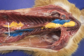 Fig. 7. NMB and ioversol longitudinal ipsilateral thoracic paravertebral spread in a dog cadaver. Ventral view.