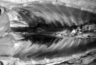 Fig. 11. NMB and ioversol longitudinal bilateral thoracic paravertebral spread in a cat cadaver. Ventral view.