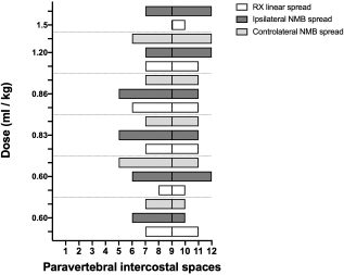 Fig. 12. Staining and contrast distribution following increasing doses of 1:1 mixture of NMB and ioversol injected in single shot at the level of the ninth intercostal space in cat cadavers. The solid line at the level of the ninth paravertebral intercostal space represents the injection site. Despite its expansivity, polyurethane foam has been proven to exert limited pressure on the surrounding tissues. In fact, when injected inside renal and pulmonary vasculature and inside the airways, after its hardening, anatomical structures such as pulmonary alveolar units and small venules were left intact and still fully recognizable (De Sordi et al., 2014). This considered, although unlikely, it is impossible to completely exclude that the physical properties of the foam could have influenced the anatomical results of this study.Based on the results of the preliminary phase and a study of the TPVS in human cadavers (Lönnqvist and Hildingsson, 1992), we performed transpleural probing of the TPVS rather than using the clinical approach in order to avoid inadvertent piercing of the dorsal parietal pleura during high-pressure injection. This non-clinical approach may be considered another limitation of our study. Although clinical studies of the TPVB in dogs and cats are lacking, multi-segmental longitudinal spread after a single injection of a local anesthetic could have several theoretical advantages over a multiple injection technique: reduction of injection-associated complications and shorter execution time. In the present study, the use of the air-LOR technique to inject a fluid into the TPVS consistently resulted in the multi-segmental longitudinal spread, which was five vertebrae lengths in almost 80% of the subjects, with major distribution cranial to the injection site. The longitudinal spread confirms previous findings in human and animal studies that used LOR, ultrasound, or electrical nerve stimulation (ENS) (Conacher and Kokri, 1987; Naja et al., 2004; Cowie et al., 2010; Portela et al., 2012; Monticelli et al., 2017; Serra et al., 2019). Despite the longitudinal multi-segmental spread, we found no direct contact between the foam and the intercostal nerves cranial or caudal to the injection site. This finding may support the influence of the endothoracic fascia on the spread of the injectate, as previously reported (Portela et al., 2017). We found no statistically significant correlation between the volume of the dye and its linear spread. Although a similar finding has been described in human studies (Conacher and Kokri, 1987; Cheema et al., 2003; Kotzé et al., 2009), the small sample size of our study could have influenced this result. In 4/14 dogs (28.6%) and 3/6 (50%) cats the dye reached and crossed the twelfth intercostal space in some cases. Therefore, it is likely that we somehow underestimated the extent of the potential for the caudal spread of the dye. Our observation of three main radiographic spread patterns (cloud-like, intercostal, and longitudinal), often combined, is shared by a previous study in humans (Naja et al., 2004). The anatomical complexity of the TPVS seems to be the key to understand the high variability of patterns after a single injection of local anesthetic. It has been hypothesized that the space-locating technique could be correlated with a specific pattern (Naja et al., 2004). In humans, the ENS-guided technique is not reliable in producing longitudinal spread and exposes the patient to risks and prolonged execution time due to multiple injections (Naja et al., 2004; Naja and Lönnqvist, 2008). Similarly, in a study in dog cadavers, the authors observed no longitudinal spread using the ENS-guided technique (Portela et al., 2012). When using a blind loco-regional technique, it could be useful to have a predictor of correct needle positioning and block extension, as well. To our knowledge, no study involving humans or animals has compared dye spread by radiographic and by post-dissection examination. We found a statistical correlation between the results of the two methods only for the longitudinal spread in the dogs; however, our defining criteria for the spread extension and the presence of partially stained intercostal spaces and vertebral bodies may have led to its underestimation in some subjects. The post-dissection subpleural linear dye spread in one cadaver where only radiographic intercostal spread was observed, suggests that x-ray pattern could be a poor predictor of the actual longitudinal distribution of local anesthetic in some patients. For this study, x-rays were taken immediately after injection of ioversol and NMB in the TPVB. Despite the lack of supporting data, it is reasonable to hypothesize that the timing between injection and image acquisition may have influenced the results. Because of the cadaveric model, the different viscosity between local anesthetics and the substances used in this study, and because of the in vivo difference between post-injection imaging and sensory block spread (Marhofer et al., 2013), no conclusion about its potential clinical use can be made. ConclusionThe air-LOR technique was proven effective for the localization of the extrapleural compartment of the TPVS, and the injection of a dye at this level resulted in multi-segmental and often bilateral subpleural staining of paravertebral, intercostal, and dorsal mediastinal structures in dog and cat cadavers. The lateral radiographic images most often showed a mixed cloud-like and linear spread pattern, which could be a predictor of the extension of longitudinal spread of the dye. The foam injection into the TPVS at the cranial and the caudal level revealed anatomical communication with the cervical, axillar, and lumbar paravertebral regions. Notwithstanding the cadaveric nature of the study, these findings may be of potential clinical interest. Further anatomical and clinical studies are needed to better understand the factors involved in this unique and 
