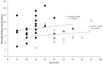 Fig. 2. Normalized hippocampal volumes vs. age for controls (black circles) and CCD dogs (open triangles). Linear regression analysis is provided for each group. There are several limitations to this study, most of which are related to its retrospective nature. Although multiple institutions were involved in recruiting case material, the case numbers are still small. Also, the MR images evaluated were derived from multiple different machines, which could introduce some level of variability in the resultant data. We restricted case enrollment to dogs 9 years and older, in accordance with previous publications dealing with aging dogs (Tapp et al., 2004; Schutt et al., 2015; Gardini et al., 2019). Although the median ages of our CCD and control groups was not large (11.5 vs. 13 years), it was statistically significant. A major hurdle in this investigation was locating control MRIs for comparison, most likely due to the low likelihood of dog owners pursuing brain MRIs for very old dogs without evidence of neurologic impairment. The possibility exists that the smaller hippocampal volumes in our CCD group were due to this group being older than the control dogs vs. a sequela to a degenerative brain disorder. The authors consider this unlikely for several reasons. Graphic representation (Fig. 2) of hippocampal volumes vs. age does not support a decreasing volume with aging for either the control or CCD groups. In addition, statistical analysis of these data failed to discern a negative correlation between advancing age and hippocampal volume in either group. Age-related hippocampal atrophy has been documented to occur as an aging change in dogs, when young dogs are compared with older dogs (Tapp et al., 2004; Gardini et al., 2019). In one study, linear MRI measurements of the hippocampi normalized to brain height were compared between young (1–3 years old) and older (>10 years old) dogs with normal brain anatomy; a significant reduction of 2.64% was found between young and old dogs in that study (Gardini et al., 2019). Although the results of our volumetric study of older dogs are not directly comparable to the results of the linear MRI study, the percentage difference between our two groups of dogs was 21.5%. In a study of laboratory Beagle dogs, hippocampal volumes were compared between young and old dogs using MRI. The older dogs were subdivided into two categories: old dogs (aged 8–11 years) and senior dogs (aged 12 years and older). Although hippocampal volume was shown to decrease when older dogs were compared to younger dogs (<8 years of age), there was no difference in hippocampal volume between the old and senior dog groups (Tapp et al., 2004). In other words, age-related hippocampal atrophy appears not to progress dramatically as a non-specific aging change in normal dogs over 8 years of age, based on the results of the Beagle study.