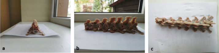 Fig. 1. (a) Canine lumbar caudo-cranial vertebrae view. (b) Canine lumbar latero-lateral vertebrae view. (c) Canine lumbar dorsoventral vertebrae view. Evaluating errorsTwo types of data were used for determining the vertebrae pressure–stretch relationships. The first was vertebra geometry data, which were retrieved directly from CT images of the euthanized dog. The CT images were imported into 3D Slicer v4.13 (Fedorov et al., 2012), ITK-SNAP (Yushkevich et al., 2006) and Osirix Lite (Rosset and Spadola, 2004) for further analysis. To estimate the confidence interval, we used three different software: 3D Slicer, Osirix Lite, and ITK-SNAP. The second type of data was that obtained from the compression machine MultiTest 2.5-i, which were presented as force (measured in N) and displacement (measured in mm). Therefore, we needed geometric data of the vertebrae to evaluate the stress–strain relationships. At first, the lengths of the vertebrae were measured by dropping two markup fiducial points and obtaining the distance between them by switching to the Markups module in 3D Slicer, selecting both fiducial points in the list, and right-clicking in the list. The fiducial points were marked between longitudinal axes of the vertebrae; one assumes the compressions are placed on the rostrocaudal axis of the vertebrae. Later, the surface area of the loading vertebra contact zone was determined by marking the intervertebral zone with a closed curve (CC) and obtaining the surface area of the close curve in the same Markups module of 3D Slicer. The obtained results are presented in Tables 1 and 2. In addition, the confidence intervals of the measured vertebrae lengths and loading surfaces were evaluated using the following expression (King and Eckersley, 2019):