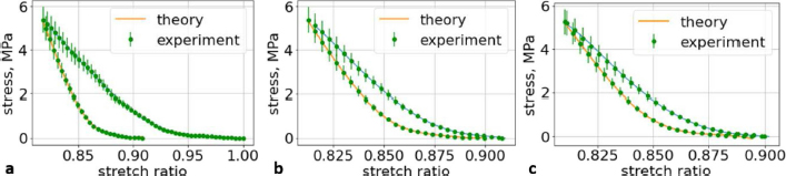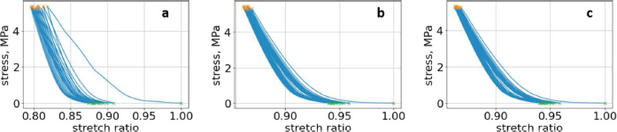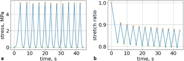 where t is the independent parameter time, and aik and dik are material constants for each load/unload cycle k. The approximation of cyclic curves was performed by second steps. We began by compressing the vertebrae using cyclic loads. We obtained hysteresis loops after compressing the vertebrae 10 times. These obtained cycles are shown in Figure 4. Following that, we determined the minimum and maximum values by analyzing the hysteresis loops. Then, the extreme values of stress and stretch versus time relationships were found. These extreme values were used to determine each compression–relaxation cycle, because each cycle is unique and should be approximated separately (Fig. 5a, b). After that, time indexes of extreme values of obtained stress and stretch array values were approximated by seventh- and second-order polynomials, accordingly. Numerical optimization was applied using the SciPy optimize curve_fit function (Virtanen et al., 2020), and polynomial coefficients were found. All these graphs (Figs. 6–8) were created using a seventh-order polynomial. It is believed that, in living organisms, the hysteresis loop is different due to the compensatory and decompensatory mechanisms involved. Normalization was performed to compare the same mechanical properties of different vertebrae.
