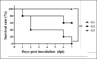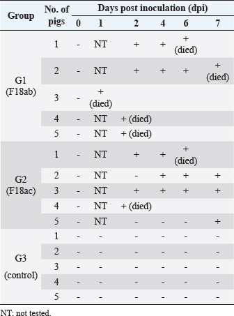 Fig. 1. Survival rate of the pigs after inoculation. Survival rate of the pigs are 0% in the G1, 60% in the G2, and 100% in the G3 at 7 dpi. Each group consists of five pigs. Groups: G1, F18ab infected; G2, F18ac infected; G3, control. ** p < 0.01. Table 2. Detection of F18ab or F18ac strains in feces.