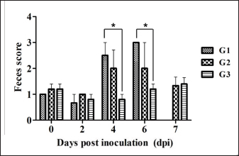 Fig. 2. Feces score of pigs after inoculation. Data are presented as means ± SEM of pigs per group. Fecal condition is scored as 4 grades (0, constipation; 1, normal; 2, mucoid; 3, watery; 4, watery and hemorrhage). Feces scores are increased markedly in the G1 and G2 than in the G3 on 4 and 6 dpi. On 7 dpi, feces score is absent or decreased in the G1 and G2 due to death or euthanasia of fatal pigs. Groups: G1, F18ab infected; G2, F18ac infected; G3, control. * p < 0.05 versus the G3. Histopathological findingsPathological changes were prominent in the small intestine (Table 3). Additionally, abnormal findings of the mucosa in all parts of the small intestine (villous atrophy, enterocyte degeneration, erosion, and E. coli attachment) of G1 were of a moderate to severe grade and had the highest score compared with G2 and G3. The scores of villous atrophy in the duodenum and ileum were higher but not statistically significant as opposed to those of the jejunum. Severe enterocyte degeneration and erosion were observed in three parts of the intestine of G1, and these were significantly higher than in G2. E. coli attachment to the villi was most prominent in the ileum of both G1 and G2 (Fig. 4). Mucosal necrosis and detached villi with hemorrhagic lesions were observed in the duodenum and jejunum of the G1 group. These lesions were more severe, with necrotic tissue and colonies of E. coli in the ileum (Fig. 5). The small intestinal mucosa and epithelium of G2 were relatively intact (Fig. 5). Inflammatory cells were also observed in the ileum. Among the inflammatory cells, markedly increased eosinophils were observed in the lamina propria of G1 and G2 (Fig. 6). In G1, mild perivascular edema and karyorrhectic cell death of myocytes in the tunica media were observed (Fig. 7). Thickened endothelial cells were also observed in affected blood vessels. These lesions were not observed in G2 or G3. Ultrastructure findingsTransmission electron microscopy of the ileum revealed numerous E. coli located on the microvilli (Fig. 8). Fimbriae were visualized between the bacteria and microvilli of G1 and G2. Vacuolation and loss of microvilli were more easily detectable in G1 than in G2. TUNEL assayTUNEL assay was performed to assess apoptotic cell death in the tunica media of blood vessels. In G1, one or two TUNEL-positive apoptotic bodies were observed in the tunica media of blood vessels (Fig. 9). In contrast, TUNEL-positive apoptotic bodies were not observed in G2 and G3. DiscussionPathogenic E. coli strains that cause diseases in pigs are generally characterized by their fimbriae type (F4, F5, F6, F41, and F18) and the presence of toxins (Pittman, 2010). Previous studies have shown that both F4 receptors and age-dependent F18 receptors are present in enterocytes, usually during the post-weaning period (Luppi, 2017; García et al., 2020), while F5, F6, and F41-positive strains affect pigs at a younger age (Luppi, 2017). F18-positive strains are known to cause diseases in the post-weaning period according to the subtype, either F18ab or F18ac (Cheng et al., 2005). Antigenic differences in F18 are related to the fedA fimbrial protein, which encodes the major fimbrial subunit of F18. In the fedA gene, F18ac has an additional proline at position 121, whereas it is either substituted or missing in F18ab (Debroy et al., 2009). We used pigs as subjects to understand the pathologic features of F18ab and F18ac E. coli isolated in Korea by inoculation of bacterial suspensions via the oral route.