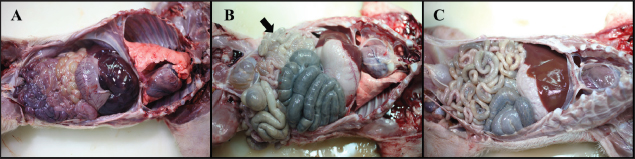 Fig. 3. Gross findings. (A) Pleural and abdominal cavity of G1. Redness of the small intestines and thin intestinal wall are observed, 6 dpi. (B) Pleural and abdominal cavity of G2. Thin intestinal wall is observed in parts (arrow) of the small intestines, with no hyperemic lesion, 7 dpi. (C) Pleural and abdominal cavity of the G3. No significant findings, 7 dpi. Groups: G1, F18ab infected; G2, F18ac infected; G3, control. Table 3. Histopathological findings in the small intestine of pigs infected with E. colia.