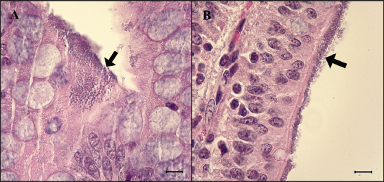Fig. 4. Attachment of the E. coli in the ileum. (A) Ileum of G1. Small round-shaped E. coli are attached to the villi (arrow) and some of them penetrate into tissue, 6 dpi. H&E, Bar=10 μm. (B) Ileum of G2. E. coli is also attached to the villi (arrow). H&E, Bar=10 μm. Groups: G1, F18ab infected; G2, F18ac infected.