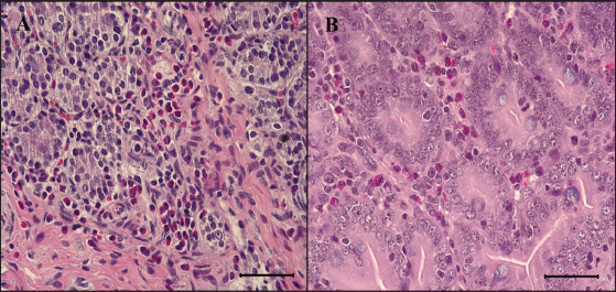 Fig. 5. Eosinophils in the small intestine of the infected pigs. (A) Large numbers of eosinophils are infiltrated in the lamina propria of G1, 6 dpi. H&E, Bar=50 μm. (B) Eosinophils are also infiltrated in the lamina propria of G2, 7 dpi. H&E, Bar=50 μm. Groups: G1, F18ab infected; G2, F18ac infected. Pathological findings for both infected groups showed different features since the stx2e toxin of F18ab E. coli can cause vascular damage, resulting in edema and hemorrhage (Clugston et al., 1974). Stx2e toxin circulates throughout the body by binding to Gb3 and Gb4 receptors on erythrocytes, and the key target organs affected by stx2e toxin are the brain and intestinal tract (Matise et al., 2000). Acutely affected pigs showed minimal microscopic lesions, which consisted of mild perivascular edema or karyorrhectic debris within myocytes of blood vessels (Methiyapun et al., 1984). The G1 group, infected with the F18ab E. coli, showed necrotic enteritis with hemorrhagic lesions, which had been observed in previous studies (Bertschinger and Pohlenz, 1983). The lesions were more severe in the ileum than in the proximal part of the small intestine because of the intense attachment of E. coli to the villi in the ileum. Moreover, karyorrhectic nuclei were also observed in the tunica media of blood vessels and positively identified by TUNEL labeling. TUNEL assay has been used in previous studies for the detection of apoptotic DNA fragmentation caused by stx2e toxin damage (Wada et al., 1997; Matise et al., 2000). Thus, the TUNEL assay results supported that the stx2e toxin released by STEC caused vascular damage in G1.