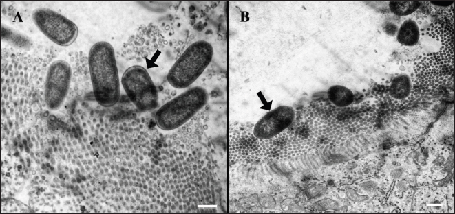 Fig. 8. Ultrastructure of E. coli attachment. (A) Ilea microvilli of G1. Numerous rod-shaped E. coli are on the microvilli of G1 (arrow). Bar=500 nm. (B) Ilea microvilli of G2. Numerous rod-shaped E. coli are also on the microvilli of G2 (arrow). Fine space between E. coli and microvilli suggests the presence of fimbriae. Bar=1,000 nm. Groups: G1, F18ab infected; G2, F18ac infected.