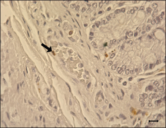 Fig. 9. Apoptosis of the blood vessel in the ileum of G1. TUNEL-positive (brown) apoptotic body (arrow) is presented in the tunica media, 6 dpi. Gill’s hematoxylin counterstain. Bar=10 μm. Group: G1, F18ab infected. In both infected groups, large numbers of eosinophils infiltrated the lamina propria. This lesion has been reported in STEC-infected pigs by previous studies (Kurtz et al., 1969), and another study suggested that eosinophil bactericidal activity against E. coli is comparable to that of neutrophils (Persson et al., 2001). Nevertheless, the specificity of eosinophil infiltration in STEC infection is currently unclear. In conclusion, the results of this study suggest that both Korean F18ab and F18ac E. coli cause diarrhea in post-weaned pigs. However, pathological lesions were distinctively observed in each subtype. The F18ab strain was more virulent than the F18ac strain, and the virulence characteristics of the F18ac strain were more similar to ETEC than STEC. AcknowledgmentsThis study was supported by the Korea Institute of Planning and Evaluation for Technology in Food, Agriculture, Forestry, and Fisheries (IPET) through the Agri-Bio Industry Technology Development Program, funded by the Ministry of Agriculture, Food, and Rural Affairs (MARFRA) (114058-03-3-CG000) and Chungnam National University. Conflict of interestAll authors have no potential conflicts of interest. Author contributionsConceptualization: Baek KH, Lee WK, Byun JW, Son HY; Formal analysis: Choi EJ, Lee KH, Lee HK; Funding acquisition: Lee WK, Son HY, Byun JW; Methodology: Lee WK; Supervision: Son HY, Byun JW; Writing - original draft: Baek KH; Writing - review & editing: Tangchang W. ReferencesBertschinger, H.U. and Pohlenz, J. 1983. Bacterial colonization and morphology of the intestine in porcine Escherichia coli enterotoxemia (edema disease). Vet. Pathol. 20(1), 99–110. Byun, J.W., Jung, B.Y., Kim, H.Y., Fairbrother, J.M., Lee, M.H. and Lee, W.K. 2013. Real-time PCR for differentiation of f18 variants among enterotoxigenic and shiga toxin-producing Escherichia coli from piglets with diarrhoea and oedema disease. Vet. J. 198(2), 538–540. Cheng, D., Sun, H., Xu, J. and Gao, S. 2005. Prevalence of fimbial colonization factors f18ab and f18ac in Escherichia coli isolates from weaned piglets with edema and/or diarrhea in China. Vet. Microbiol. 110(1–2), 35–39. Clugston, R.E., Nielsen, N.O. and Smith, D.L. 1974. Experimental edema disease of swine (E coli enterotoxemia). 3. Pathology and pathogenesis. Can. J. Comp. Med. 38(1), 34–43. Debroy, C., Roberts, E., Scheuchenzuber, W., Kariyawasam, S. and Jayarao, B.M. 2009. Comparison of genotypes of Escherichia coli strains carrying f18ab and f18ac fimbriae from pigs. J. Vet. Diagn. Invest. 21(3), 359–364. Do, K.H., Byun, J.W. and Lee, W.K. 2019. Prevalence of O-serogroups, virulence genes, and F18 antigenic variants in Escherichia coli isolated from weaned piglets with diarrhea in Korea during 2008-2016. J. Vet. Sci. 20(1), 43–50. Fairbrother, J.M. and Nadeau, É. 2019. Colibacillosis. In Diseases of swine. 11th ed. Eds., Zimmerman, J J, Locke, A, Karriker L.A, Ramirez, A, Schwartz K.J, Stevenson, GW. and Zhang J. New York, NY: John Wiley Sons, pp: 807–832. Faubert, C. and Drolet, R. 1992. Hemorrhagic gastroenteritis caused by Escherichia coli in piglets: clinical, pathological and microbiological findings. Can. Vet. J. 33(4), 251–256. Francis, D.H., Grange, P.A., Zeman, D.H., Baker, D.R., Sun, R. and Erickson, A.K. 1998. Expression of mucin-type glycoprotein k88 receptors strongly correlates with piglet susceptibility to k88(+) enterotoxigenic Escherichia coli, but adhesion of this bacterium to brush borders does not. Infect. Immun. 66(9), 4050–4055. Gannon, V.P., Gyles, C.L. and Wilcock, B.P. 1989. Effects of Escherichia coli shiga-like toxins (verotoxins) in pigs. Can. J. Vet. Res. 53(3), 306–312. García, V., Gambino, M., Pedersen, K., Haugegaard, S., Olsen, J.E. and Herrero-Fresno, A. 2020. F4- and F18-positive enterotoxigenic Escherichia coli isolates from diarrhea of postweaning pigs: genomic characterization. Appl. Environ. Microbiol. 86(23), e01913–20. Gyles, C.L. and Fairbrother, J.M. 2010. Escherichia coli. In Pathogenesis of bacterial infections in animals. 4th ed. Eds., Gyles, C.L., Prescott, J.F. and Songer, J.G. Ames, IA: Wiley-Blackwell, pp: 267–308. Hahn, E., Wild, P., Schraner, E.M., Bertschinger, H.U., Häner, M., Müller, S.A. and Aebi, U. 2000. Structural analysis of f18 fimbriae expressed by porcine toxigenic Escherichia coli. J. Struct. Biol. 132(3), 241–250. Imberechts, H., De Greve, H. and Lintermans, P. 1992. The pathogenesis of edema disease in pigs. A review. Vet. Microbiol. 31(2–3), 221–233. Kim, Y.J., Kim, J.H., Hur, J. and Lee, J.H. 2010. Isolation of Escherichia coli from piglets in South Korea with diarrhea and characteristics of the virulence genes. Can. J. Vet. Res. 74(1), 59–64. Konstantinova, L., Hamrik, J., Kulich, P., Kummer, V., Maskova, J. and Alexa, P. 2008. The effect of intramuscular administration of colistin on the development and course of experimentally induced oedema disease in weaned piglets. Vet. Microbiol. 128(1-2), 160–166. Kurtz, H.J., Bergeland, M.E. and Barnes, D.M. 1969. Pathologic changes in edema disease of swine. Am. J. Vet. Res. 30(5), 791–806. Lee, J.B., Kim, S.K. and Yoon, J.W. 2022. Pathophysiology of enteropathogenic Escherichia coli during a host infection. J. Vet. Sci. 23(2), e28. Luppi, A. 2017. Swine enteric colibacillosis: diagnosis, therapy and antimicrobial resistance. Porcine Health Manag. 3, 16. Macleod, D.L., Gyles, C.L. and Wilcock, B.P. 1991. Reproduction of edema disease of swine with purified shiga-like toxin-ii variant. Vet. Pathol. 28(1), 66–73. Matise, I., Sirinarumitr, T., Bosworth, B.T. and Moon, H.W. 2000. Vascular ultrastructure and DNA fragmentation in swine infected with shiga toxin-producing Escherichia coli. Vet. Pathol. 37(4), 318–
