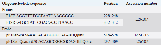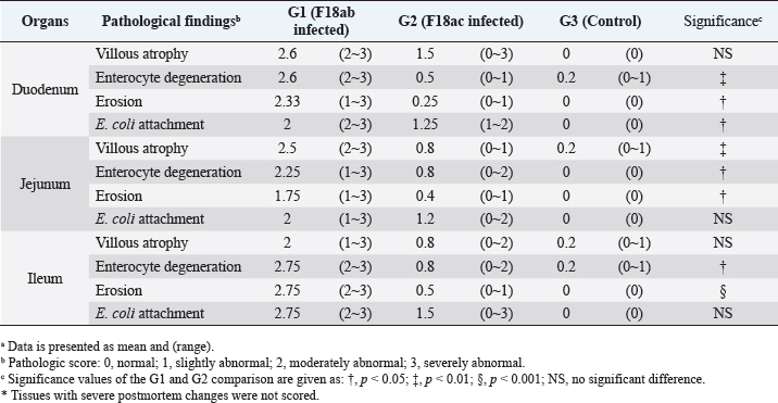 AbstractBackground: In the porcine industry, Escherichia coli (E. coli) infections have been causing post-weaning diarrhea (PWD) and edema disease (ED) for many years. It is classified into pathotypes and serotypes in animals according to virulence factors. Serotyping is performed for O, K, H, and F antigens, essential for discriminating pathogenicity and epidemiology. Furthermore, E. coli strains that produce F18 fimbriae are major sources of ED and PWD associated with Shiga-toxin producing E. coli (STEC) expressing F18ab and enterotoxigenic E. coli (ETEC) expressing F18ac, respectively. Aim: To investigate the pathogenicity potential and infection characteristics of experimental infection and confirm the pathological features of the Korean STEC/ETEC strains F18ab and F18ac in piglets. Methods: Three-week-old pigs were randomized into three experimental groups: infected G1 (F18ab), infected G2 (F18ac), and G3 (control). General health status was monitored daily, and pathological changes were evaluated. Results: Diarrhea occurred in all infected piglets. Pathological changes were only observed in the small intestine and regional lymph nodes. In G1, mucosal necrosis, inflammatory cell infiltration with hemorrhagic lesions, and apoptotic cell death in the tunica media of arterioles in the small intestine were observed. In contrast, the mucosa and epithelium appeared almost intact, with no abnormal vessel lesions in G2. Conclusion: Both strains, isolated from pigs in Korea, could be infected and did not spread from the alimentary tract to other organs. The pathological features were quite different among the F18 subtypes. The F18ab strain was more virulent than F18ac, and the virulence characteristics of the F18ac strain were more similar to ETEC than STEC. Keywords: Edema disease, Enteropathogenic Escherichia coli, F18 variants, Korean strains, Post-weaning diarrhea. IntroductionEscherichia coli (E. coli) is a Gram-negative bacterium that belongs to Enterobacteriaceae (Fairbrother and Nadeau, 2019). It is known as one of the common bacterial flora. However, some E. coli acquires virulence factors, including pili and enterotoxins encoded in plasmids, and are mediated by bacteriophages and subsequently cause disease (Pittman, 2010). E. coli is generally subdivided by pathotype and serotype, associated with certain virulence traits. Pathogenic E. coli in animals is classified as enterotoxigenic E. coli (ETEC), Shiga toxin-producing E. coli (STEC), enterohemorrhagic E. coli (EHEC); enteropathogenic E. coli (EPEC), and extraintestinal pathogenic E. coli (ExPEC) by virulence mechanism, as indicated by the presence of virulence factors (Gyles and Fairbrother, 2010). ETEC colonizes the small intestine via specific adhesion factors (fimbriae) (Nagy and Fekete, 1999) and produces heat-stable enterotoxins (STa or STb) and heat-labile enterotoxins (LT). STEC produces the Shiga toxin variant (stx2e), which causes vascular lesions in the intestine, subcutis, and brain, leading to edema and neurological symptoms (Imberechts et al., 1992). EPEC, originally isolated from humans, resembles ETEC, which causes diarrhea. Intimin, the outer membrane protein of EPEC, is involved in the intimate attachment of the bacteria to enterocytes (Lee et al., 2022). For serotypes, they are designated by O (somatic), K (capsular), H (flagellar), and F (fimbria) antigens. At least 188 O, 103 K, 56 H, and over 20 F antigens have been officially recognized to date (Fairbrother and Nadeau, 2019). E. coli infections are commonly associated with diarrhea, edema disease (ED), and septicemia in pigs (Pittman, 2010). Among these, post-weaning diarrhea (PWD) and ED are major causes of economic loss in the porcine industry worldwide (Pittman, 2010; Nagy and Fekete, 1999). According to the Korea Animal Health Integrated System (www.kahis.go.kr), 880 cases of E. coli-associated pig infections were diagnosed from 2012 to 2014. Notably, these included E. coli isolation (423), detection of pathogenic E. coli (285), colibacillosis (110), ED (52), suspected colibacillosis (4), polyserositis (2), and suspected ED (2). The data showed that ED and PWD are constant causes of major concern in Korea. PWD and ED could occur independently or simultaneously in pig farms, as it is difficult for the practitioner or farmer to distinguish between them because their symptoms overlap (Imberechts et al., 1992; Fairbrother and Nadeau, 2019). Furthermore, F18-expressing E. coli is associated with the pathogenesis of ED and PWD in post-weaned pigs (Gannon et al., 1989; Do et al., 2019). In Korea, recent studies have reported that F18-positive E. coli is the predominant strain causing diarrhea (Kim et al., 2010). F18 is subtyped into three antigenic variants: F18ab (formerly F107), F18ac (2134P and 8813), and F18 (new variant) (Byun et al., 2013). Generally, STEC-expressing F18ab fimbriae is associated with ED, whereas ETEC-expressing F18ac fimbriae is associated with PWD (Zhang et al., 2007). The cause of the disease might be identified based on the pathological findings. However, the virulence traits and pathogenesis of ETEC/STEC that produce F18ac fimbriae are obscure, and only a few reports of in vivo experimental data exist. Therefore, the present study aimed to determine the pathogenicity and pathological characteristics of the domestically isolated F18ab (STEC) and F18ac (STEC/ETEC) strains isolated in experimentally infected post-weaning piglets. Materials and MethodsEscherichia coli strainsTwo strains (O139:stx2e:F18ab:AIDA, O35:LT:STa:stx2e:F18ac:AIDA) isolated from pigs in Korea were used in this study. The strains were grown on blood agar (Asan, Korea) for 24 hours at 37°C. The bacteria were washed thrice with phosphate-buffered saline (PBS) and centrifuged at 8,000 × g. Colony forming units/ml (CFU/ml) were counted by the standard 10-fold dilution method. For animal experiments, both strains were adjusted to 1010 CFU/ml. Animals and inoculationFi