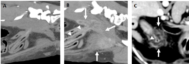 Fig. 1. Examples of fragments of wooden skewer perforating a jejunal loop. A and B. Parasagittal pre (A) and postcontrast (B) images (level 40 HU, width 250 HU) of the same patient with a fragmented wooden skewer (arrowheads) perforating the jejunum in the caudal abdomen with the ending tip penetrating the right psoas muscles. In the pre-contrast images, the portion of the foreign body embedded in the soft tissues is better visualized than in the post-contrast images, while the soft tissue abscessation is better depicted in the latter (arrows). C. Transverse post-contrast CT image (level 40 HU, width 250 HU) of another patient showing a hypoattenuating fragmented wooden skewer foreign body (arrowhead) penetrating a jejunal loop in the cranial abdomen. A marked peritoneal fat stranding is seen surrounding the small bowel loop and foreign body (arrows).