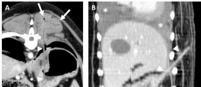 Fig. 3. Examples of gastric foreign bodies from the stomach with the ending tip in the paravertebral or thoracic wall soft tissues. A. Transverse post-contrast CT image (level 40 HU, width 250 HU) of a dog with a wooden skewer (arrowheads) extending from the stomach and ending in the left epaxial muscles. Mild fluid accumulation and emphysema are seen surrounding the ending tip of the foreign body (arrows). B. Dorsal post-contrast CT image (level 40 HU, width 250 HU) of a dog with a wooden skewer (arrowheads) perforating the gastric wall with an oblique orientation ending in the subcutaneous tissue of the left thoracic wall. A moderate bilateral pleural effusion is seen associated with this foreign body (asterisks). The limitations of this study include those inherent to its retrospective nature. The small number of cases precluded statistical analysis. Also, the fact that all cases were retrieved from the teleradiology archive may have introduced historical data recording inaccuracies, as well as variability from the multiple attending surgeons and referral institutions. ConclusionIn conclusion, in dogs with ingested wooden skewers that perforate and migrate from the gastrointestinal tract, CT can effectively identify them, especially in pre-contrast images, and the diverse secondary lesions, most of the times with concurrent affection of several body parts. Pneumoperitoneum or peritoneal effusion were uncommon findings contrary to what is expected with gastrointestinal perforation. Paraspinal abscesses and pulmonary lesions were relatively common in the presence of a large gastric wooden skewer. The authors recommend this technique for the diagnosis and surgical planning of this particular type of wooden foreign body. Conflict of interestThe authors declare that there is no conflict of interest. FundingThis research received no specific grant. Authors’ contributionsAll authors contributed to the conception and design of the article. AC conducted the retrieval of the data and literature review. VC revised the final manuscript. All authors read and approved the article. Data availabilityAll data supporting the findings of this study are available within the manuscript. ReferencesAppleby, R., Zur Linden, A., Singh, A., Finck, C. and Crawford, E. 2015. Computed tomography diagnosis of a thoracic and abdominal penetrating foreign body in a dog. Can. Vet. J. 56, 1149–1152. Baudin Tréhiou, C., Gibert, S., Sériot, P., Dunié-Mérigot, A. and Blond, L. 2020. CT is helpful for the detection and presurgical planning of lung perforation in dogs with spontaneous pneumothorax induced by grass awn migration: 22 cases. Vet. Radiol. Ultrasound. 61, 157–166. Bertolini, G., Briola, C., Angeloni, L., Costa, A., Rocchi, P. and Caldin, M. 2020. Trauma-associated pulmonary laceration in dogs-a cross sectional study of 364 dogs. Vet. Sci. 7, 41. Bezuidenhout, A.J. 2013. The lymphatic system. In Miller’s anatomy of the dog, 4th edition. Eds., Evans, H. and de Lahunta, A. St Louis, MO: Elseivier Saunders, pp: 535–562. Bosma, F., Gerritsen, R., Visser, J. and Passon-Vastenburg, M. 2022. Contrast-enhanced CT findings in a dog with a wood foreign body in the vertebral canal. Vet. Radiol. Ultrasound. 63, 6–10. Boysen, S.R., Tidwell, A.S. and Penninck, D.G. 2003. Ultrasonographic findings in dogs and cats with gastrointestinal perforation. Vet. Radiol. Ultrasound. 44, 556–564. Brennan, S.F., Connery, N., Tobin, E., Mooney, C.T. and Jones, B.R. 2004. Gastrocutaneous fistula as a result of migration of a foreign body in a dog. J. Small Anim. Pract. 45, 304–306. Cho, H.J., Jeon, Y.B., Ma, D.S., Lee, J.N. and Chung, M. 2015. Traumatic pulmonary pseudocysts after blunt chest trauma: prevalence, mechanisms of injury, and computed tomography findings. J. Trauma Acute Care Surg. 79, 425–430. Choi, Y.D. and Han, H.J. 2017. Pyothorax induced by an intrathoracic foreign body in a miniature dachshund: migration of a popsicle stick from the stomach. J. Vet. Med. Sci. 79, 1398–1403. Garcia-Pertierra, S., Das, S., Burton, C., Barnes, D., Murgia, D., Anderson, D., Kulendra, N., Harris, K. and Forster, K. 2022. Surgical management of intrathoracic wooden skewers migrating from the stomach and duodenum in dogs: 11 cases (2014-2020). J. Small Anim. Pract. 63, 403–411. Griffeuille, E., Seriot, P., Baudin-Tréhiou, C., Gibert, S., Blond, L., Poujol, L. and Dunié-Mérigot, A. 2021. Comparison of computed tomography and surgical findings and investigation of their associations with outcomes for dogs with sublumbar abscesses. J. Am. Vet. Med. Assoc. 259, 1300–1308. Griffiths, L.G., Tiruneh, R., Sullivan, M. and Reid, S.W. 2000. Oropharyngeal penetrating injuries in 50 dogs: a retrospective study. Vet. Surg. 29, 383–388. Hennessey, E., Cassel, N., Nuth, E. and Biller, D. 2022. CT can identify characteristic features of hypaxial muscle abscesses in dogs due to presumed migrating vegetal foreign material as well as additional changes along the migratory tract in other anatomic regions. Vet. Radiol. Ultrasound. 63, 691–698. Hunt, G.B., Worth, A. and Marchevsky, A. 2004. Migration of wooden skewer foreign bodies from the gastrointestinal tract in eight dogs. J. Small Anim. Pract. 45, 362–367. Hylands, R. 2007. Veterinary diagnostic imaging: 9-cm wooden foreign body lodged in the sternocephalic muscle in the caudal part of the neck. Can. Vet. J. 48, 643–645. Jacques, D., Meige, F. and Thierry, F. 2019. Clinical, computed tomographic, surgical findings and outcome in dogs with sublumbar abscessation: 16 cases (2013-2019). J. Small Anim. Pract. 63, 147–153. Jang, S., Lee, S. and Choi, J. 2022. CT imaging features of fat stranding in cats and dogs with abdominal disorder. J. Vet. Sci. 23(6), e70. Lamb, C.R. and Neiger, R. 2000. Radiology corner: differential diagnosis of pulmonary cavitary lesions. Vet. Radiol. Ultrasound. 4, 340–341. Lamb, C.R., Pope, E.H. and Lee, K.C. 2017. Results of computed tomography in