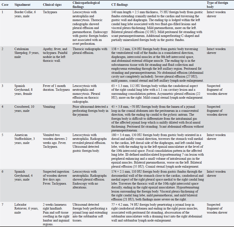 AbstractBackground: Perforating foreign bodies from the gastrointestinal tract, such as wooden skewers, are reported in the small animal literature producing inflammatory/infectious lesions in the thorax, abdomen, and musculoskeletal system, which can be life-threatening in some instances. Several imaging modalities have been used, and advanced imaging techniques have shown a great advantage in its diagnosis and pre-surgical planning. Aim: The objective of this study is to describe the computed tomographic findings in a group of seven medium to large breed dogs with perforating wooden skewers and foreign bodies migrated from the gastrointestinal tract. Methods: The medical records database was searched for dogs with a suspected diagnosis of a perforating wooden foreign body migrated from the gastrointestinal tract in which a computed tomographic study was performed. Signalment, history, and clinicopathological findings (when available) were retrieved, and the computed tomographic studies were reviewed. Results: Clinical signs vary depending on the anatomical regions affected through the perforating pathway. All foreign bodies were identified and showed a median attenuation of 79 HU, with the most common localization being the stomach followed by the jejunum. Peritoneal fat stranding surrounding the perforation site was the most frequent computed tomographic finding. The presence of peritoneal free fluid and/or gas was uncommon. Pleural effusion, pulmonary perforation, and pneumothorax were present in most of the cases with the foreign body traversing the pleural space. Pulmonary cavitary lesions were always reported when the ending tip of the wooden skewer was within the pulmonary parenchyma. Soft tissue abscessation was recognized in all cases where the ending tip was lodged in muscular or subcutaneous tissues. Conclusion: Findings supported the variability of the secondary lesions caused by this type of foreign body and the utility of computed tomography in their recognition, as well as in the identification of the wooden skewer. Keywords: Canine, Computed tomography, Gastrointestinal perforation, Ingested foreign body, Kebab stick. IntroductionDifferent types of migrating foreign bodies are described throughout the small animal literature with variable presentations and clinical signs depending on the time of presentation, route of entry, or secondary lesions along the migrating pathway. Wooden stick foreign bodies are one of the commonest in dogs, usually related to oropharyngeal lesions attributable to chewing or retrieving behavior (Griffiths et al., 2000; Nicholson et al., 2008; White and Lane, 2008), but also reported in numerous anatomical locations after distant migration from the oropharyngeal region (O’Reilly et al., 2002; Young et al., 2004; Hylands, 2007; Lamb et al., 2017), suspected or witnessed traumatic impalements (Moon et al., 2012; Perry et al., 2012; Appleby et al., 2015; Lamb et al., 2017; Bosma et al., 2022) or ingestion and migration from the gastrointestinal tract (Matteucci et al., 1999; Wyatt et al., 1999; Penninck and Mitchell, 2003; Brennan et al., 2004; Hunt et al., 2004; Sereda et al., 2009; Choi and Han, 2017; Lamb et al., 2017; Stander and Kirberger, 2011; Garcia-Pertierra et al., 2022). The latter is a relatively frequent situation, especially if the foreign body has been in contact with food because of its high palatability (Choi and Han, 2017), as is the case of wooden skewers. Once ingested, wooden skewers or pointed portions of other long wooden sticks have a tendency to perforate and migrate from the gastrointestinal tract given their length and sharply pointed ends (Hunt et al., 2004; Choi and Han, 2017), potentially causing inflammatory or infectious disease of the abdomen, thorax and/or musculoskeletal system, occasionally associated with subcutaneous draining tracts. Diverse imaging procedures such as plain radiography, fistulography/sinography, ultrasonography, computed tomography (CT), and magnetic resonance imaging (MRI) have been used alone or in combination to identify wooden foreign bodies and accompanying secondary lesions in the previously referenced literature. Various of these case reports and series highlight the utility of CT with such penetrating foreign bodies, especially as part of preoperative planning. Moreover, noncontrast CT has been evaluated and proved more accurate (sensitivity 75%, specificity 96%) than ultrasound or MRI for the detection of acute wooden foreign bodies in cadaveric dogs (Ober et al., 2008). In another study describing the CT findings in dogs with suspected wooden foreign bodies, the sensitivity and specificity of this technique were determined to be 79% and 93% (Lamb et al., 2017). The aim of this study is to describe the computed tomographic findings in a group of dogs with perforating wooden skewer foreign bodies migrated from the gastrointestinal tract. Materials and MethodsThis is a retrospective case series study design. The medical records database of the Anicura Hospital Veterinario Valencia Sur (AHVVS; Valencia, Spain), including teleradiology cases, was searched for dogs with a suspected diagnosis of a perforating wooden foreign body migrated from the gastrointestinal tract in which a computed tomographic study was performed as a part of the diagnostic investigation. The studies found were only from the teleradiology archive. Data collected from records included signalment, history, and clinicopathological findings when available. Authorized consent regarding the use of clinical data and imaging exams for publication purposes was obtained from the owners. Additional information regarding the surgical confirmation and type (when possible) of the wooden foreign body was requested from the referring colleagues. For the purposes of this study, CT images were retrieved and reviewed by a board-certified veterinary radiologist [VC, American College of Veterinary Radiology and European College of Veter