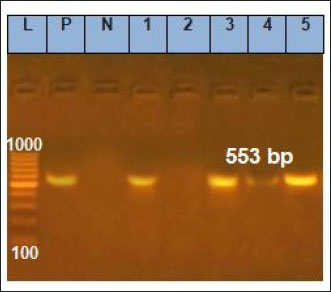 Fig. 2. A representative figure showing agarose gel electrophoresis of PCR for the detection of COWP gene of Cryptosporidium spp. Lane L: molecular weight marker, 100 bp. Lane P: positive control of COWP gene with a band of amplicon size at 553 bp. Lane N: negative control. Lanes 1, 3, 4, 5: positive samples. Lane 2: negative sample.